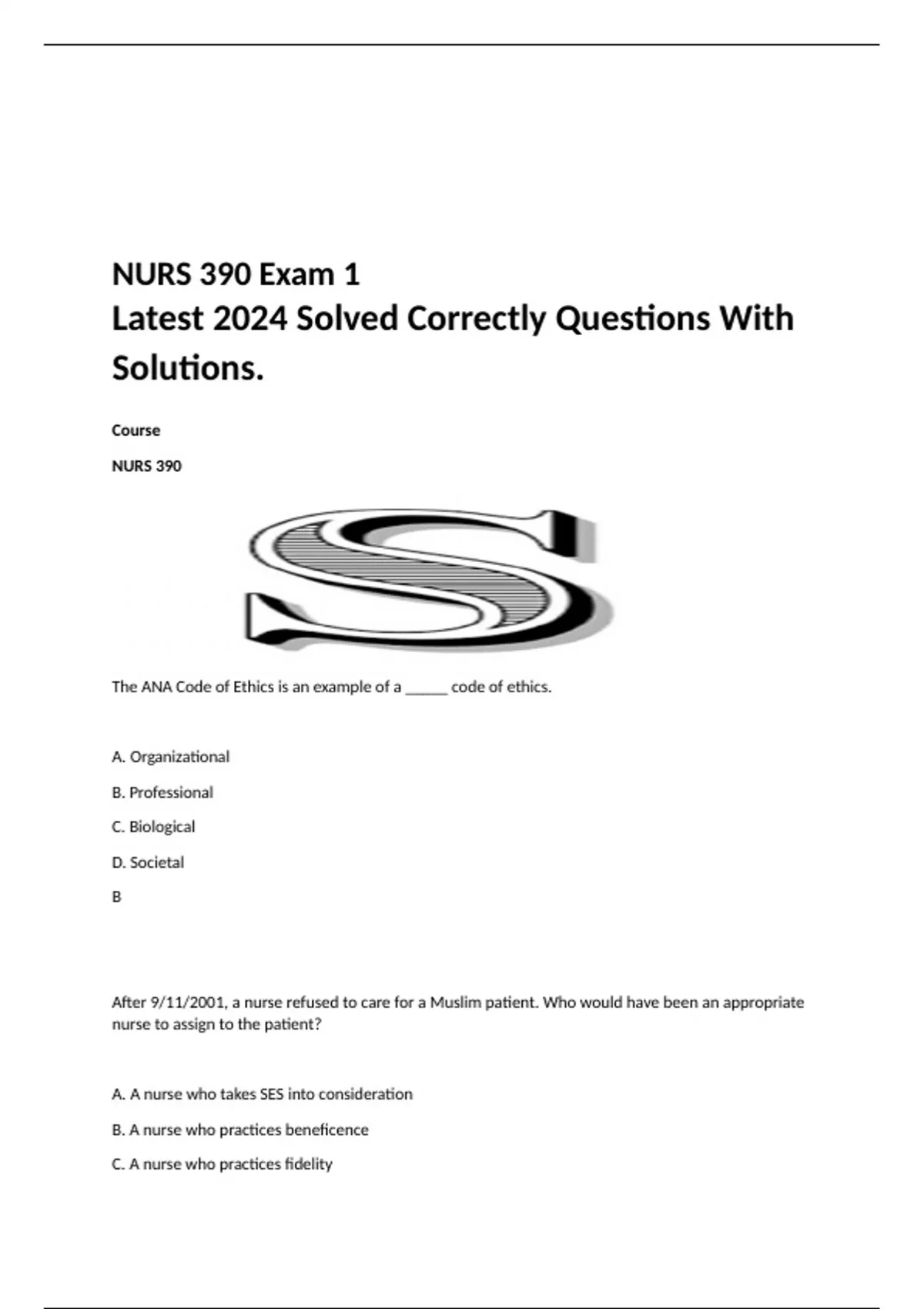 NURS 390 Exam 1 Questions With Complete Solutions NURS 390 Exam 1 Course NURS 390 The ANA Code of Ethics is an example of a _____ code of ethics. A. Organizational B. Professional C. Biological D. Societal B After 9/11/2023, a nurse refused to care for a Muslim patient. Who would have been an appropriate nurse to assign to the patient? A. A nurse who takes SES into consideration B. A nurse who practices beneficence C. A nurse who practices fidelity D. A nurse who practices with justice D You arrive on time to your unit, give your medications on time, and advocate for your patient. You are displaying: A. Fidelity B. Beneficence C. Justice D. Self-esteem A In a company's mission and vision, the company states their values and principles that guide them. This is an example of: A. Professional ethics B. Societal ethics C. Personal ethics D. Organizational ethics D A patient is taking warfarin daily. The nurse is acting out of beneficence would teach: A. To drink OJ while taking the medication B. Respectful nurse-patient interactions C. Appropriate dietary restrictions D. An exercise and breathing routine C The nurse set a time with the patient to begin discharge teaching. A nurse who acted out of fidelity would: A. Arrive on time B. Bring the patient all the discharge materials at once C. Arrive with a cultural component appropriate to the patient D. Prepare to give the patient a bath A