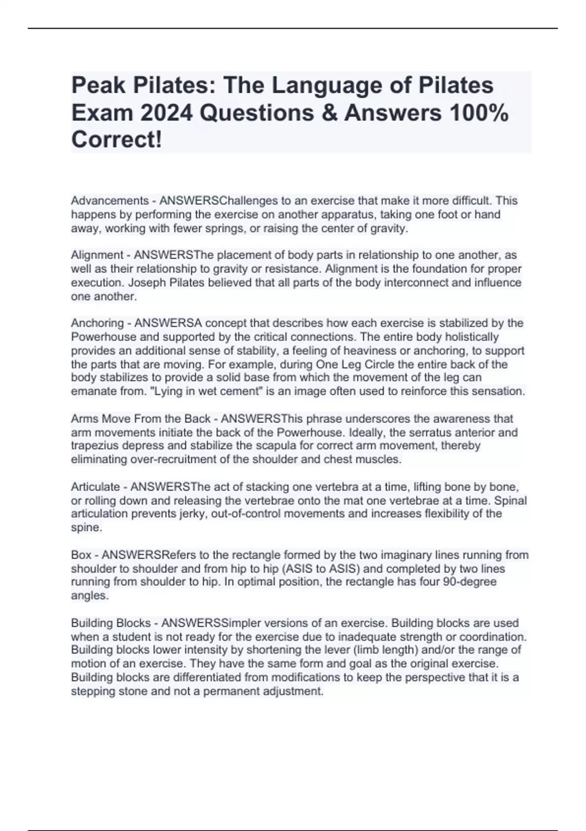 Peak Pilates: The Language of Pilates Exam 2024 Questions & Answers 100% Correct!