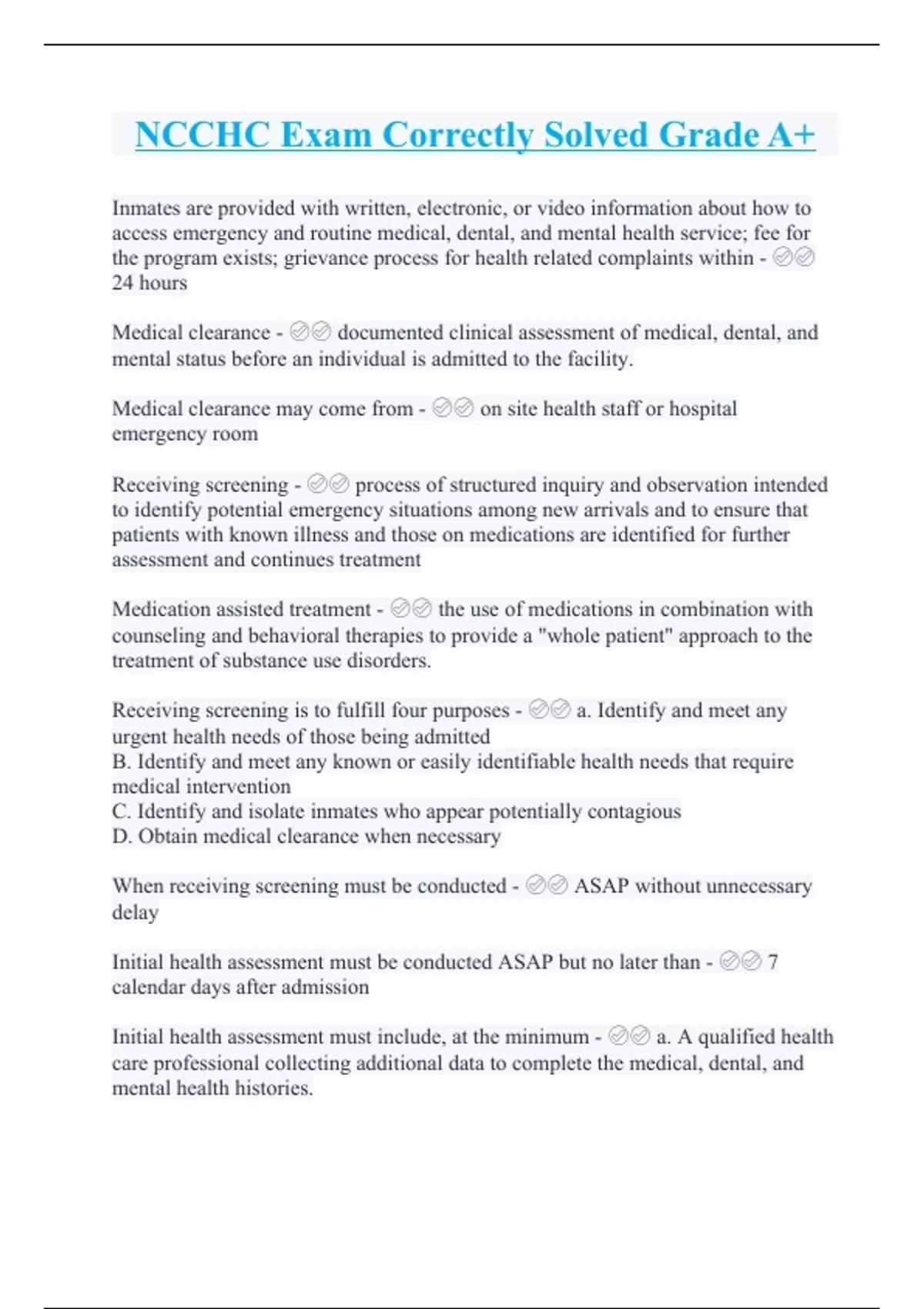 Inmates are provided with written, electronic, or video information about how to access emergency and routine medical, dental, and mental health service; fee for the program exists; grievance process for health related complaints within - 24 hours Medical clearance - documented clinical assessment of medical, dental, and mental status before an individual is admitted to the facility. Medical clearance may come from - on site health staff or hospital emergency room Receiving screening - process of structured inquiry and observation intended to identify potential emergency situations among new arrivals and to ensure that patients with known illness and those on medications are identified for further assessment and continues treatment Medication assisted treatment - the use of medications in combination with counseling and behavioral therapies to provide a "whole patient" approach to the treatment of substance use disorders. Receiving screening is to fulfill four purposes - a. Identify and meet any urgent health needs of those being admitted B. Identify and meet any known or easily identifiable health needs that require medical intervention C. Identify and isolate inmates who appear potentially contagious D. Obtain medical clearance when necessary When receiving screening must be conducted - ASAP without unnecessary delay Initial health assessment must be conducted ASAP but no later than - 7 calendar days after admission