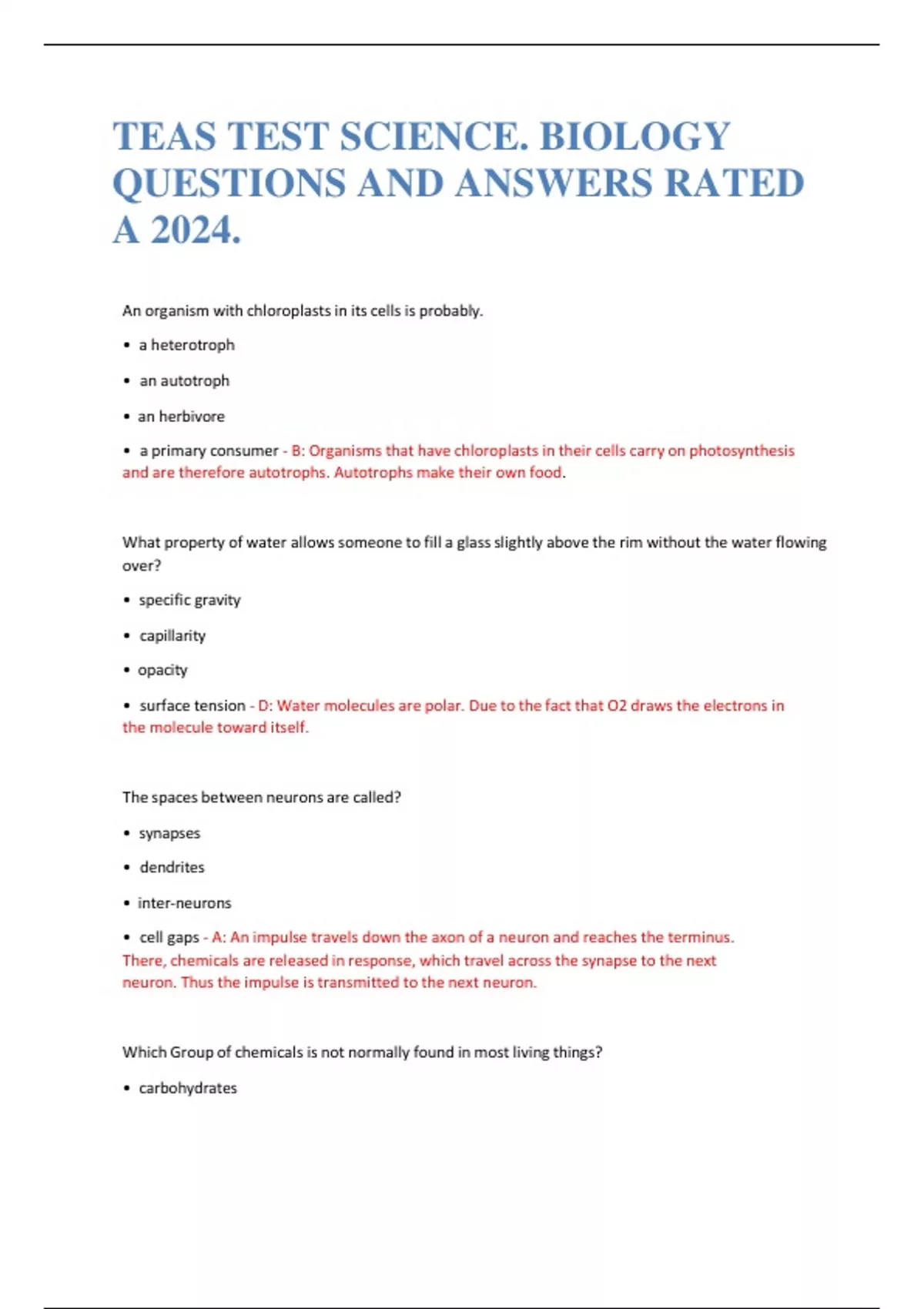 TEAS TEST SCIENCE. BIOLOGY QUESTIONS AND ANSWERS RATED A 2024.