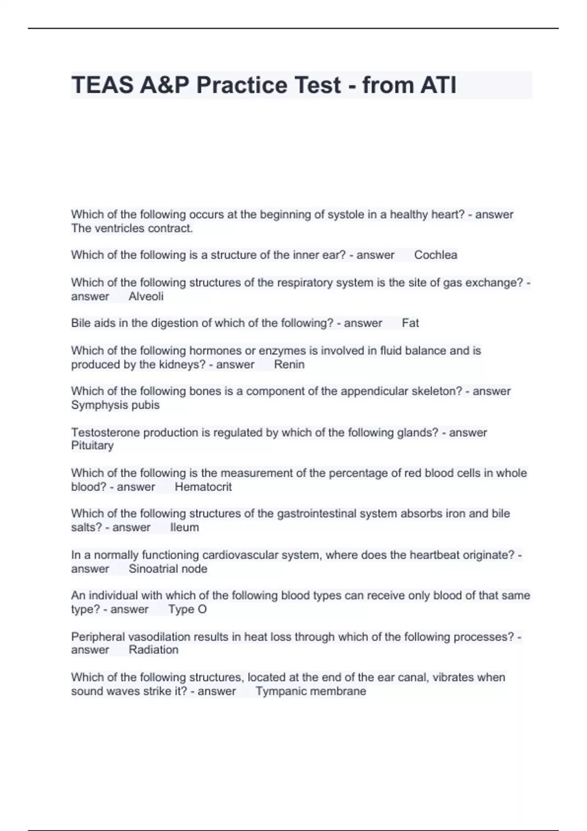 TEAS A&P Practice Test - from ATI Questions and Answers Fully solved 2024