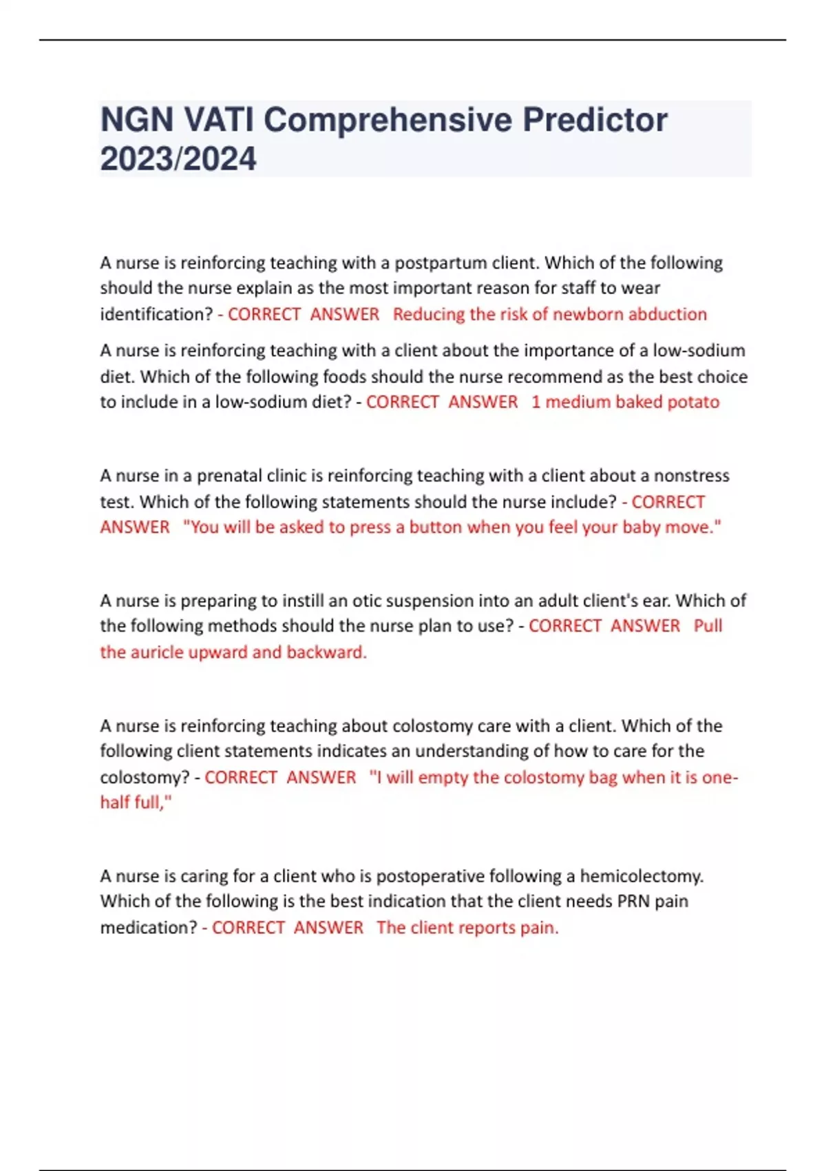 age child who has an active case of Pediculosis humanus capitis. Which of the following should the nurse include in the teaching? - CORRECT ANSWER Wash the bed linens in hot water. A nurse in an inpatient mental health facility is caring for a client who has bipolar disorder and is in an acute manic episode. Which of the following activities should the nurse suggest for the client? - CORRECT ANSWER Take a walk with a staff member, A nurse is reinforcing healthy eating habits for an older adult client to ensure adequate dietary intake. Which of the following is an appropriate recommendation? - CORRECT ANSWER Snack between meals. A nurse in a provider's office is collecting data from a client who was discharged from the hospital 7 days ago following treatment for deep -vein thrombosis. Which of the following findings is the nurse's priority? (Click on the "Exhibit" button for additi onal information about the client. There are three tabs that contain separate categories of data.) - CORRECT ANSWER The client takes ibuprofen daily to treat musculoskeletal pain. A nurse is preparing to administer an IM injection to a client. To reduc e the risk of a needlestick injury, the nurse should take which of the following actions? - CORRECT ANSWER Dispose of the used needle immediately in a puncture -proof sharps container. A nurse is reviewing the laboratory results for a client who is at 3 2 weeks of gestation. For which following results should the nurse notify the provider? - CORRECT ANSWER Platelet count 90,000/mm3 A nurse is reinforcing teaching with a client who has a new prescription for levothyroxine. Which of the following statem ents indicates understanding of the instructions? - CORRECT ANSWER "I need to take this medication for the rest of my life." A nurse is preparing to administer purified protein derivative (PPD) to a client. The nurse should use which of the following r outes? - CORRECT ANSWER Intradermal A nurse in a clinic is reinforcing teaching with a client who has a new prescription for a combination contraceptive transdermal patch. Which of the following should the nurse include in the teaching? - CORRECT ANSW ER Apply the patch to the lower abdomen," A nurse is reinforcing teaching with a parent about appropriate snacks for a toddler. Which of the following foods should the nurse include? - CORRECT ANSWER Graham crackers