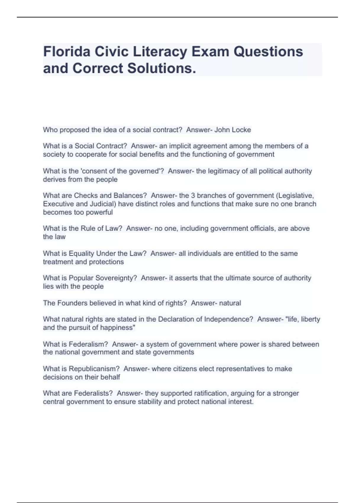 Florida Civic Literacy Exam Questions and Correct Solutions