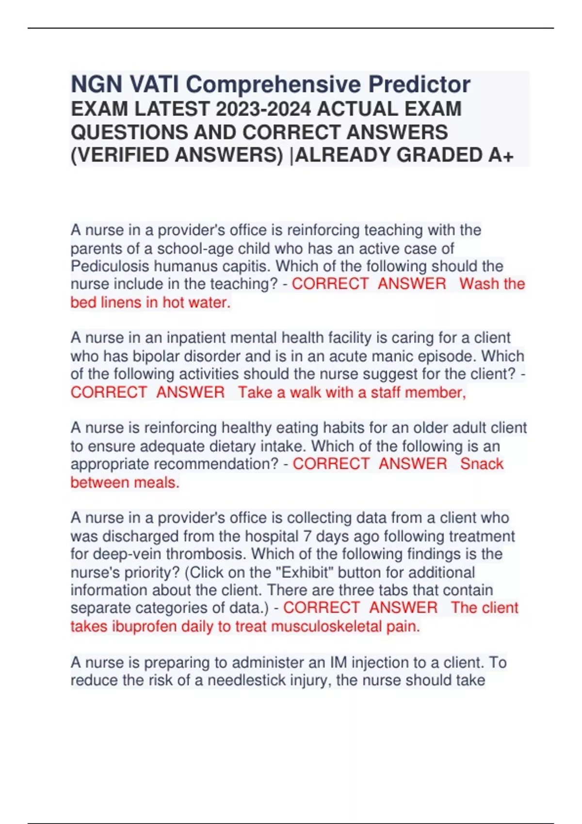 NGN VATI Comprehensive Predictor EXAM LATEST ACTUAL EXAM QUESTIONS AND CORRECT ANSWERS (VERIFIED ANSWERS) |ALREADY GRADED A+ A nurse in a provider's office is reinforcing teaching with the parents of a school-age child who has an active case of Pediculosis humanus capitis. Which of the following should the nurse include in the teaching? - CORRECT ANSWER Wash the bed linens in hot water. A nurse in an inpatient mental health facility is caring for a client who has bipolar disorder and is in an acute manic episode. Which of the following activities should the nurse suggest for the client? - CORRECT ANSWER Take a walk with a staff member, A nurse is reinforcing healthy eating habits for an older adult client to ensure adequate dietary intake. Which of the following is an appropriate recommendation? - CORRECT ANSWER Snack between meals. A nurse in a provider's office is collecting data from a client who was discharged from the hospital 7 days ago following treatment for deep-vein thrombosis. Which of the following findings is the nurse's priority? (Click on the "Exhibit" button for additional information about the client. There are three tabs that contain separate categories of data.) - CORRECT ANSWER The client takes ibuprofen daily to treat musculoskeletal pain. A nurse is preparing to administer an IM injection to a client. To reduce the risk of a needlestick injury, the nurse should take which of the following actions? - CORRECT ANSWER Dispose of the used needle immediately in a puncture-proof sharps container. A nurse is reviewing the laboratory results for a client who is at 32 weeks of gestation. For which following results should the nurse notify the provider? - CORRECT ANSWER Platelet count 90,000/mm3 A nurse is reinforcing teaching with a client who has a new prescription for levothyroxine. Which of the following statements indicates understanding of the instructions? - CORRECT ANSWER "I need to take this medication for the rest of my life." A nurse is preparing to administer purified protein derivative (PPD) to a client. The nurse should use which of the following routes? - CORRECT ANSWER Intradermal A nurse in a clinic is reinforcing teaching with a client who has a new prescription for a combination contraceptive transdermal patch. Which of the following should the nurse include in the teaching? - CORRECT ANSWER Apply the patch to the lower abdomen," A nurse is reinforcing teaching with a parent about appropriate snacks for a toddler. Which of the following foods should the nurse include? - CORRECT ANSWER Graham crackers A nurse is caring for a client who has COPD. The client tells the nurse, "I get short of breath during meals. It is too much trouble to eat." Which of the following instructions should the nurse suggest? - CORRECT ANSWER "Have several small meals during the day."