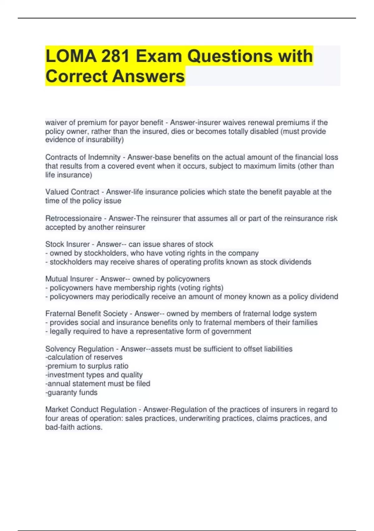 LOMA 281 Exam Questions with Correct Answers waiver of premium for payor benefit - Answer-insurer waives renewal premiums if the policy owner, rather than the insured, dies or becomes totally disabled (must provide evidence of insurability) Contracts of Indemnity - Answer-base benefits on the actual amount of the financial loss that results from a covered event when it occurs, subject to maximum limits (other than life insurance) Valued Contract - Answer-life insurance policies which state the benefit payable at the time of the policy issue Retrocessionaire - Answer-The reinsurer that assumes all or part of the reinsurance risk accepted by another reinsurer Stock Insurer - Answer-- can issue shares of stock - owned by stockholders, who have voting rights in the company - stockholders may receive shares of operating profits known as stock dividends Mutual Insurer - Answer-- owned by policyowners - policyowners have membership rights (voting rights) - policyowners may periodically receive an amount of money known as a policy dividend Fraternal Benefit Society - Answer-- owned by members of fraternal lodge system - provides social and insurance benefits only to fraternal members of their families - legally required to have a representative form of government Solvency Regulation - Answer--assets must be sufficient to offset liabilities -calculation of reserves -premium to surplus ratio -investment types and quality -annual statement must be filed -guaranty funds