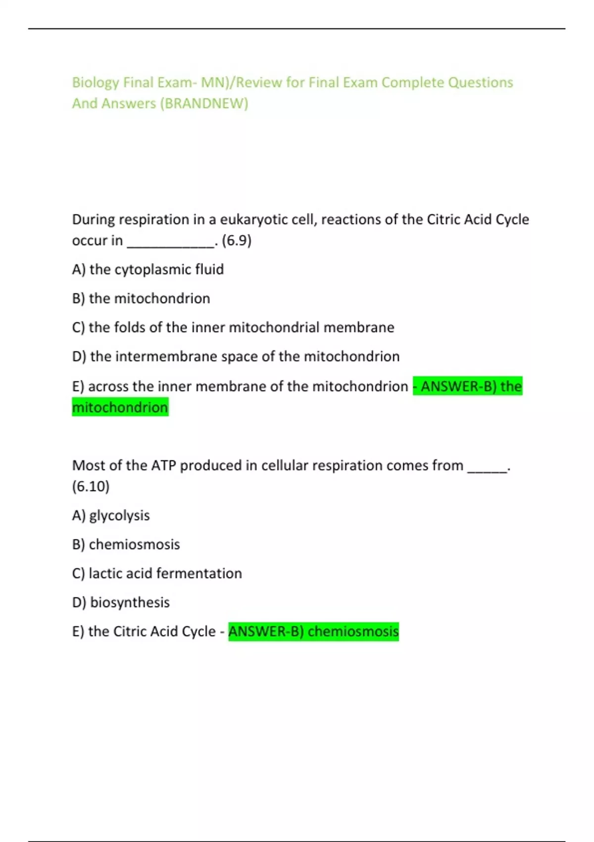 Biology Final Exam- MN)/Review for Final Exam Complete Questions And Answers (BRANDNEW)