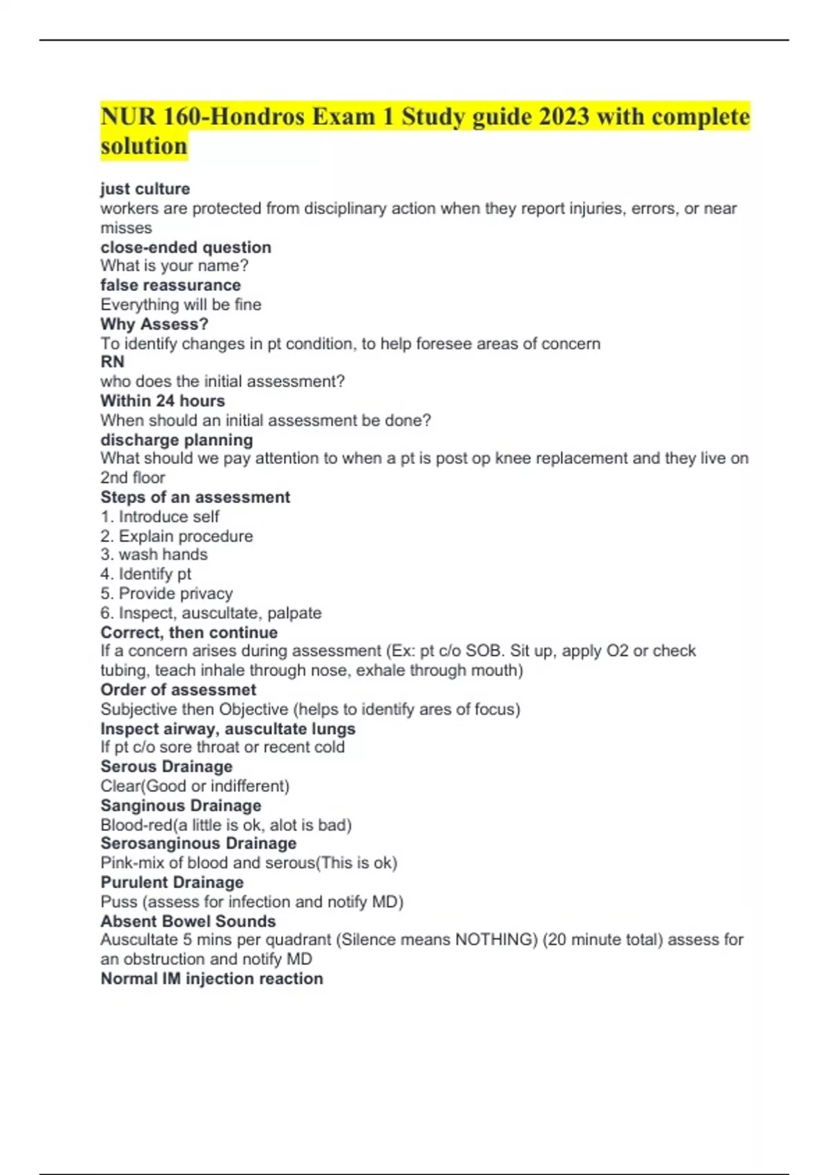 NUR 160-Hondros Exam 1 Study guide 2023 with complete solution just culture workers are protected from disciplinary action when they report injuries, errors, or near misses close-ended question What is your name? false reassurance Everything will be fine Why Assess? To identify changes in pt condition, to help foresee areas of concern RN who does the initial assessment? Within 24 hours When should an initial assessment be done? discharge planning What should we pay attention to when a pt is post op knee replacement and they live on 2nd floor Steps of an assessment 1. Introduce self 2. Explain procedure 3. wash hands 4. Identify pt 5. Provide privacy 6. Inspect, auscultate, palpate Correct, then continue If a concern arises during assessment (Ex: pt c/o SOB. Sit up, apply O2 or check tubing, teach inhale through nose, exhale through mouth) Order of assessmet Subjective then Objective (helps to identify ares of focus) Inspect airway, auscultate lungs If pt c/o sore throat or recent cold Serous Drainage Clear(Good or indifferent) Sanginous Drainage Blood-red(a little is ok, alot is bad) Serosanginous Drainage Pink-mix of blood and serous(This is ok) Purulent Drainage Puss (assess for infection and notify MD) Absent Bowel Sounds Auscultate 5 mins per quadrant (Silence means NOTHING) (20 minute total) assess for an obstruction and notify MD Normal IM injection reaction Burning at site, itching at site, bruising Abnormal IM injection Reaction vomiting, constipation, dry mouth, rash (systemic) TB testing 1. Must be read 48-72 hrs (assessed) 2. Document date, time of injection and reading, as well as result 3. Mild swelling is normal TB result-negative 10mm- healthcare workers are a strict 10 TB result-positive red, raised (induration) Positive TB result This means that the person has been exposed to TB At risk for TB nursing homes, jails, homeless, certain meds, some other countries, healthcare workers Hyperglycemia hot and dry-sugar high Hypoglycemia cold and clammy-needs some candy Symptoms of Hyperglycemia extreme thirst, frequent urination, dry skin, hunger, blurred vision, drowsiness, nausea Symptoms of Hypoglycemia shaking, tachycardia, sweating, anxious, dizzy, hunger, impaired vision, weakness, fatigue, headaches, irritable insulin NPH-longer lasting (cloudy) Regular- faster acting (clear) Order of Insulin Draw cloudy(air), clear(air),clear(insulin), cloudy(insulin) 70-110 Normal BS Vision Intervention Annual Eye Exam Vision Assessment PERRLA, peripheral testing, snellen chart, Hx (changes in vision?, dark spots?, flashes?, issues in certain lighting?) Vision pt education Certain drops can burn eyes, burning is better than being blind (miotics) Hearing interventions 1. Face to face 2. Speak clearly, slowly and directly 3. Eliminate background noise Hearing Treatment audiology Cataract Assessment