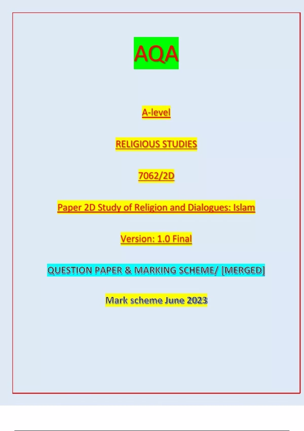 AQA A-level RELIGIOUS STUDIES 7062/2D Paper 2D Study of Religion and Dialogues: Islam Version: 1.0 Final IB/M/Jun23/E3 7062/2D