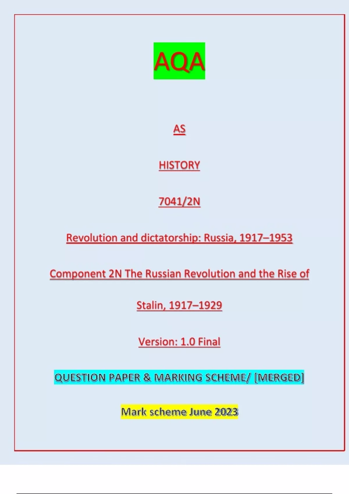 AQA AS HISTORY 7041/2N Revolution and dictatorship: Russia, 1917–1953 Component 2N The Russian Revolution and the Rise of Stalin, 1917–1929 Version: 1.0 Final IB/M/Jun23/E2 7041/2N AS HISTORY