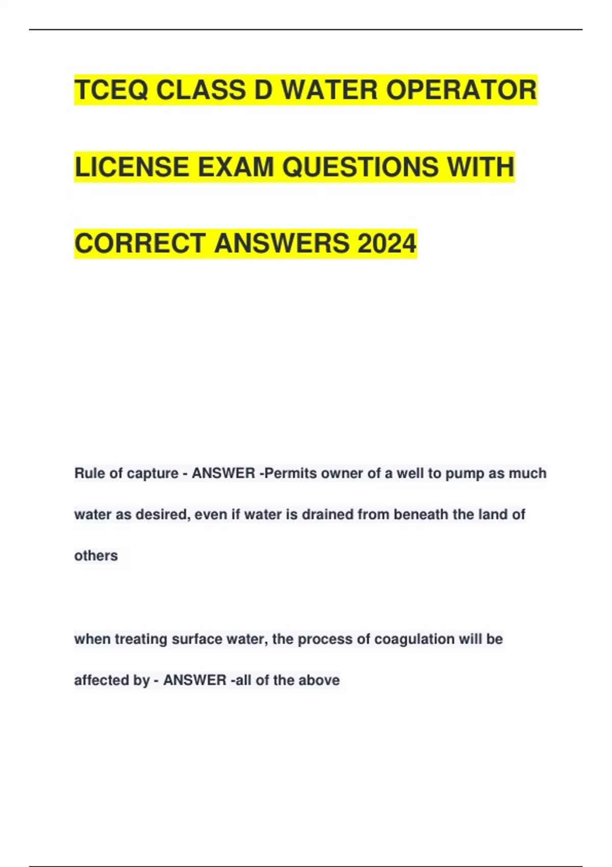 TCEQ CLASS D WATER OPERATOR LICENSE EXAM QUESTIONS WITH CORRECT ANSWERS 2024 TCEQ CLASS D WATER OPERATOR LICENSE EXAM QUESTIONS WITH CORRECT ANSWERS 2024 TCEQ CLASS D WATER OPERATOR LICENSE EXAM QUESTIONS WITH CORRECT ANSWERS 2024 TCEQ CLASS D WATER OPERATOR LICENSE EXAM QUESTIONS WITH CORRECT ANSWERS 2024 TCEQ CLASS D WATER OPERATOR LICENSE EXAM QUESTIONS WITH CORRECT ANSWERS 2024