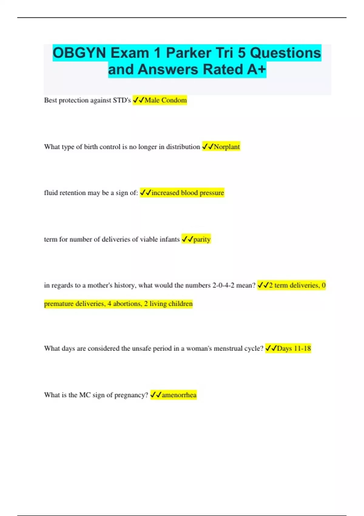 OBGYN Exam 1 Parker Tri 5 Questions and Answers Rated A+