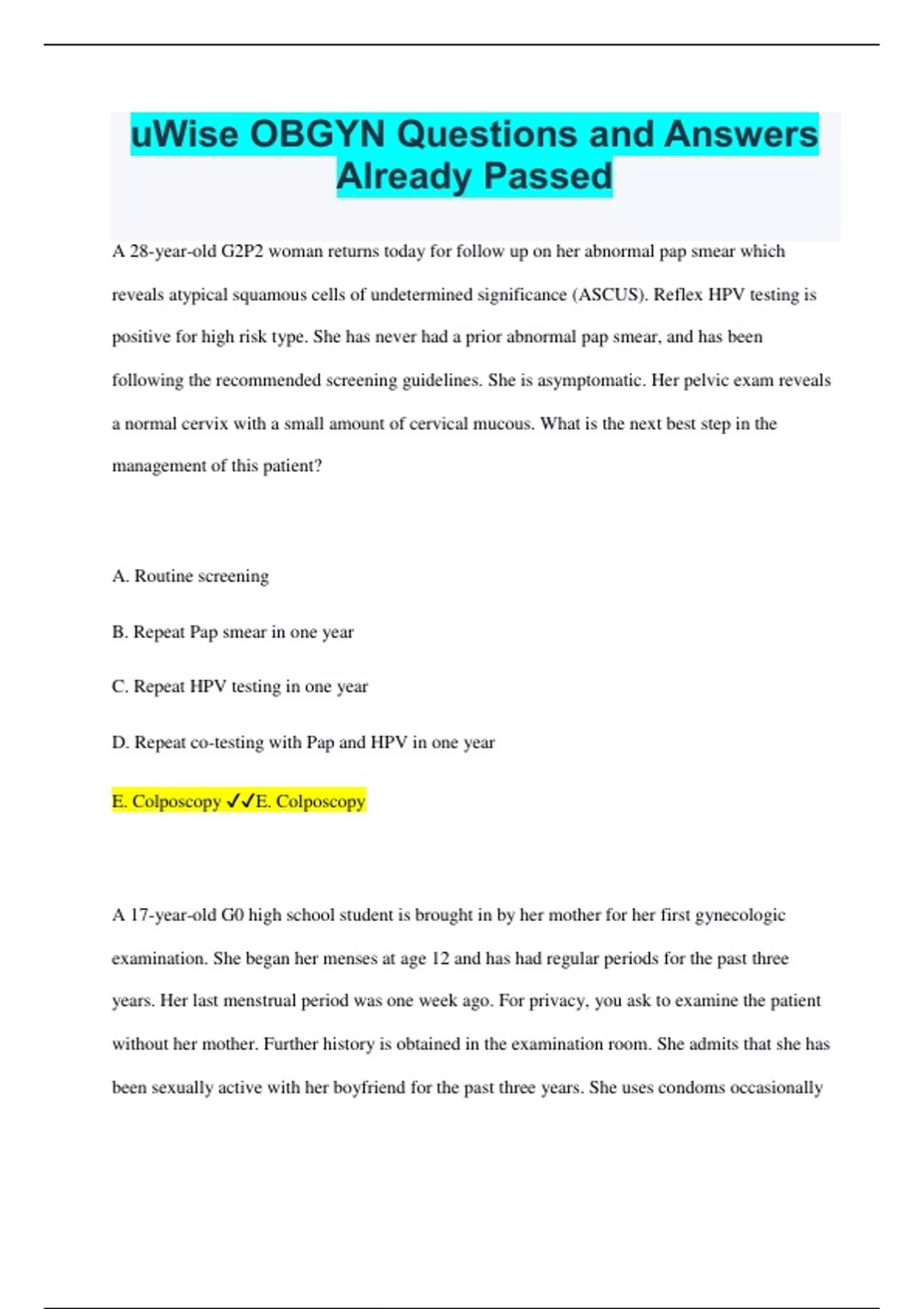 uWise OBGYN Questions and Answers Already Passed A 28-year-old G2P2 woman returns today for follow up on her abnormal pap smear which reveals atypical squamous cells of undetermined significance (ASCUS). Reflex HPV testing is positive for high risk type. She has never had a prior abnormal pap smear, and has been following the recommended screening guidelines. She is asymptomatic. Her pelvic exam reveals a normal cervix with a small amount of cervical mucous. What is the next best step in the management of this patient? A. Routine screening B. Repeat Pap smear in one year C. Repeat HPV testing in one year D. Repeat co-testing with Pap and HPV in one year E. Colposcopy E. Colposcopy A 17-year-old G0 high school student is brought in by her mother for her first gynecologic examination. She began her menses at age 12 and has had regular periods for the past three years. Her last menstrual period was one week ago. For privacy, you ask to examine the patient without her mother. Further history is obtained in the examination room. She admits that she has been sexually active with her boyfriend for the past three years. She uses condoms occasionally and is fearful about possible pregnancy. She requests that her mother not be informed about her sexual activity. On physical examination, she is anxious, but normally developed. Her pelvic examination reveals no vulvar lesions, minimal non-malodorous discharge, and a nulliparous appearing cervix. The bimanual examination reveals a normal size uterus, and her adnexa are non-tender and not enlarged. Urine pregnancy test is negative. In addition to discussing C Counseling about and screening for sexually transmitted infections is the best next step. This patient does not require treatment due to a lack of diagnostic criteria. A serum Beta-hCG is not indicated in the setting of normal menstrual cycles with last menstrual period a week ago and a negative urine pregnancy test. Guidelines for initiation of cervical cancer screening is recommended at age 21 regardless of coitarche. A pelvic ultrasound would not be indicated at this time especially since the pregnancy test is negative and given her lack of menstrual or pelvic symptoms. A 68-year-old G2P2 woman who has recently moved in with her daughter (a long-standing patient of yours) comes in for a health maintenance examination. A vaginal hysterectomy was done in her fifties for uterine prolapse. She is not sure if her ovaries were removed. She has never had an abnormal mammogram or Pap smear and has had yearly exams. She stopped hormone replacement therapy 10 years ago. She was recently widowed after being married for 50 years. She does not smoke or drink. Her diabetes is well-controlled with Metformin; she takes a daily baby aspirin and is on a lipid-lowering agent. On examination, she is a thin elderly woman with a dowager's hump. Her breast exam