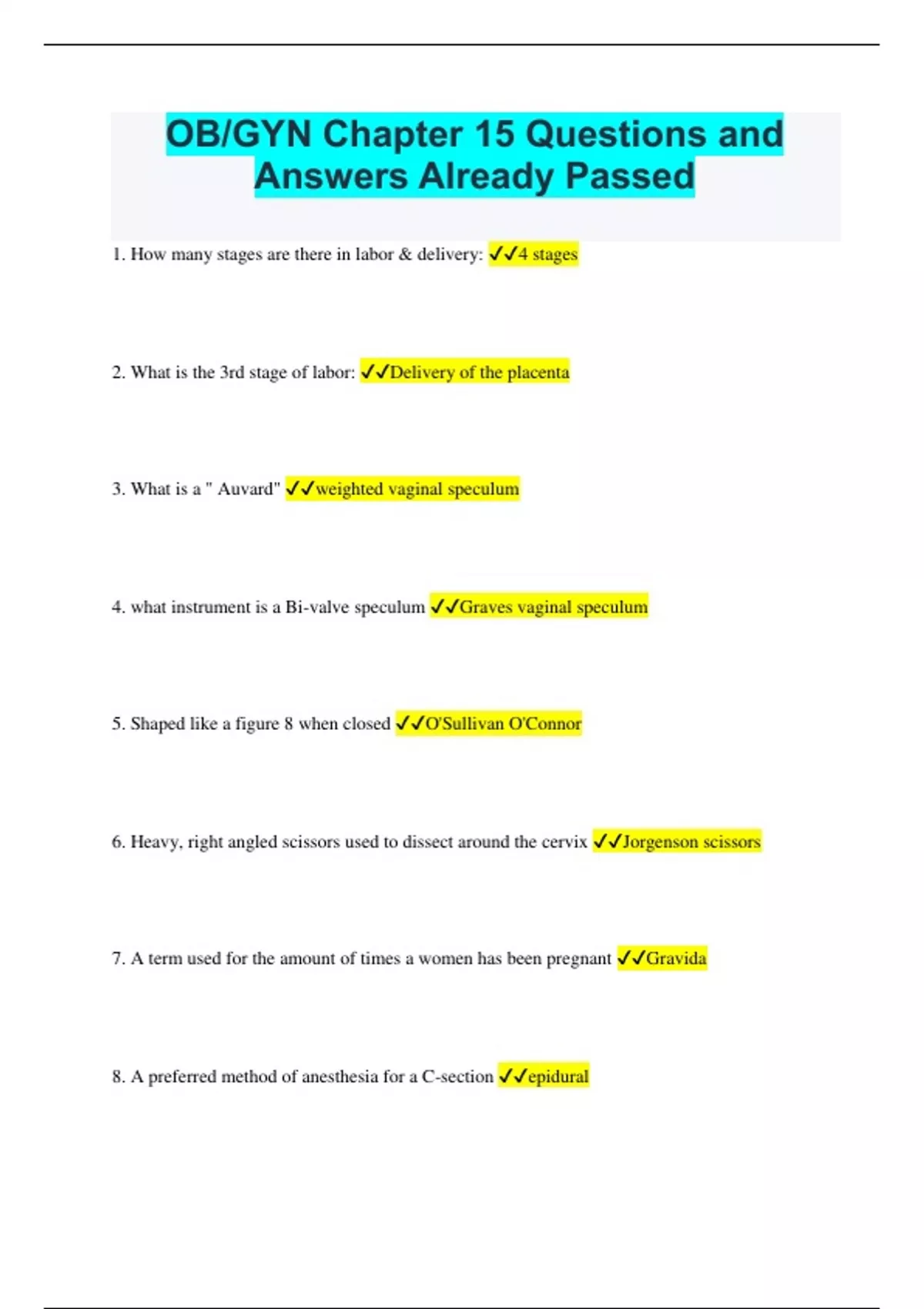 OB/GYN Chapter 15 Questions and Answers Already Passed 1. How many stages are there in labor & delivery: 4 stages 2. What is the 3rd stage of labor: Delivery of the placenta 3. What is a " Auvard" weighted vaginal speculum 4. what instrument is a Bi-valve speculum Graves vaginal speculum 5. Shaped like a figure 8 when closed O'Sullivan O'Connor 6. Heavy, right angled scissors used to dissect around the cervix Jorgenson scissors 7. A term used for the amount of times a women has been pregnant Gravida 8. A preferred method of anesthesia for a C-section epidural 9. The first intraoperative count during a C-section is done when when the first suture to close the uterus is passed to the surgeon 10. A woman in her first pregnancy or has only delivered once Primipara 11. The fallopian tubes attach to the uterus at the: cornu 12. What is used after delivery to clear out the mouth and the nares of the neonate Bulb syringes 13. An anterior colporrhaphy is the procedure preformed to fix urinary incontinence or cystocele 14. During a pelvic exenteration the patient is left with no vagina, rectum or any female reproductive organs and will have a colostomy and an ileostomy 15. Seizers or coma in a pregnant patient during or shortly after birth Eclampsia 16. The STSR will need to have plenty of what instrument available for an A&P Repair Allis' 17. Tubal ligations are done for elective sterilization 18. Cherney, Maylard, and Pfannenstiel are all transverse abdominal incisions 19. What is routinely placed during a laparoscopy A uterine manipulator 20. a separate set-up and glove change is needed for laparoscopy 21. fecal matter in the amniotic fluid Meconium 22. What size of suture is used during Tuboplasty 8-0 or 9-0 23. The treatment for an infected Bartholin's cyst is called Marsupialization 24. during a Marsupialization, the procedure