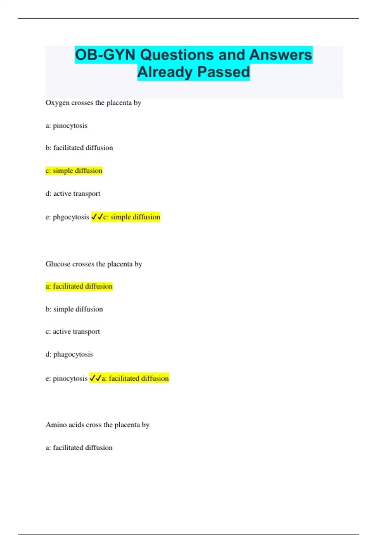 OB-GYN Questions and Answers Already Passed Oxygen crosses the placenta by a: pinocytosis b: facilitated diffusion c: simple diffusion d: active transport e: phgocytosis c: simple diffusion Glucose crosses the placenta by a: facilitated diffusion b: simple diffusion c: active transport d: phagocytosis e: pinocytosis a: facilitated diffusion Amino acids cross the placenta by a: facilitated diffusion b: active transport c: pinocyctosis d: simple diffusion e: phagocytosis b: active transport Pregnancy has what effect on gastric motility? a: Gastric motility typically remains the same b: The effect on gastric motility is unpredictable c: Gastric motility typically increases d: Gastric motility typically decreases d: Gastric motility typically decreases Pregnancy has what effect on gastric reflux? a: The effect on gastric reflux is unpredictable b: Gastric reflux is typically unaffected c: Gastric reflux typically decreases d: Gastric reflux typically increases d: Gastric reflux typically increases "Morning sickness" typically begins during which weeks of pregnancy? a: 1-3 weeks b: 16-22 weeks c: 10-12 weeks d: 14-18 weeks e: 4-8 weeks e: 4-8 weeks Changes in gastrointestinal motility during pregnancy are related to increased levels of a: thyrotropin-releasing factor b: human chorionic gonadotropin c: estrogen d: oxytocin e: progesterone e: progesterone Transit time in the stomach and small bowel increases by what percent in the second and third trimesters of pregnancy? a: 60%-70% b: 1%-15% c: 45%-60% d: 30%-45% e: 15%-30% e: 15%-30%