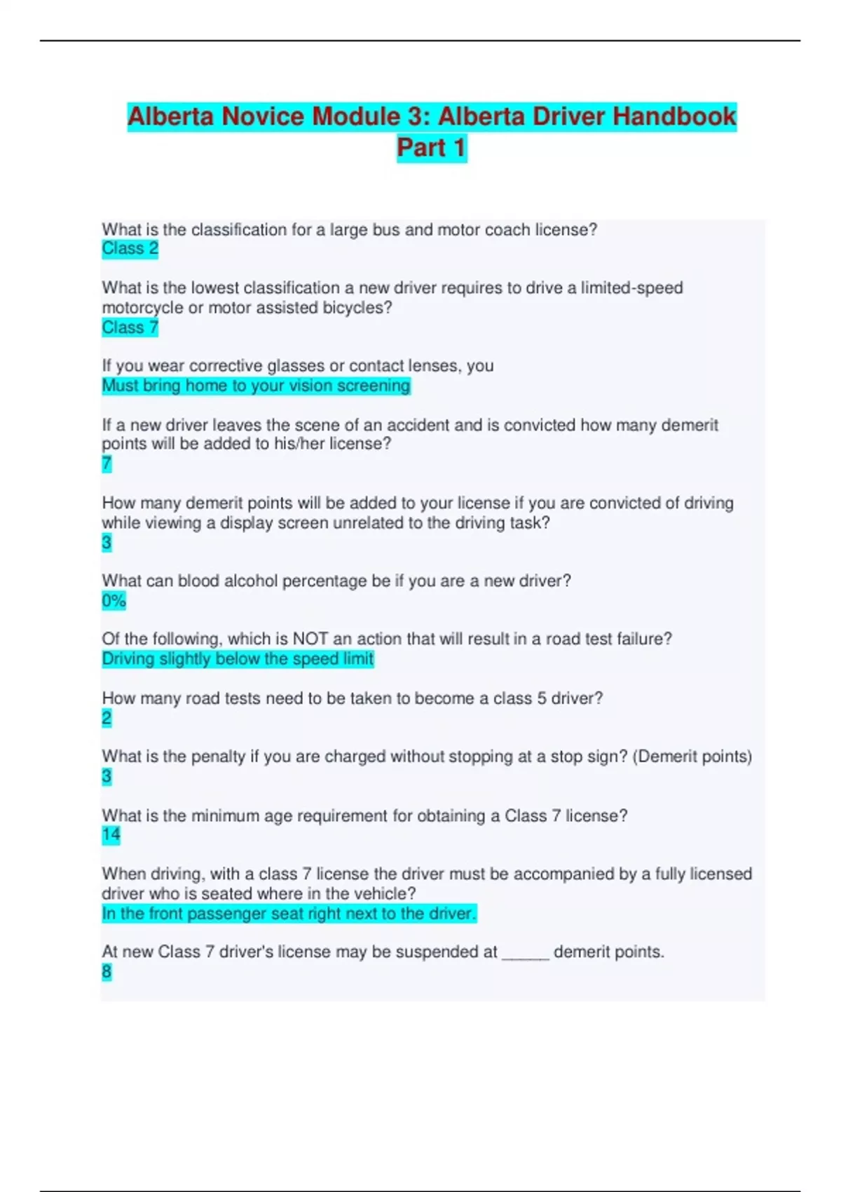 Alberta Novice Module 3: Alberta Driver Handbook Part 1 - Q & A What is the classification for a large bus and motor coach license? Class 2 What is the lowest classification a new driver requires to drive a limited-speed motorcycle or motor assisted bicycles? Class 7 If you wear corrective glasses or contact lenses, you Must bring home to your vision screening If a new driver leaves the scene of an accident and is convicted how many demerit points will be added to his/her license? 7 How many demerit points will be added to your license if you are convicted of driving while viewing a display screen unrelated to the driving task? 3 What can blood alcohol percentage be if you are a new driver? 0%