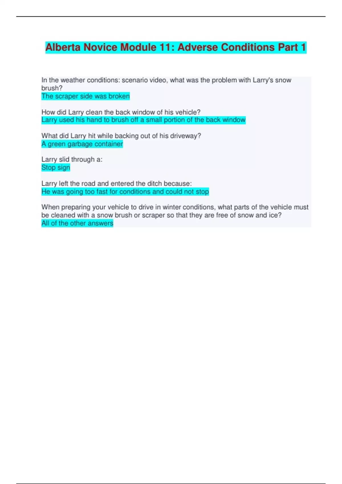 ALBERTA NOVICE MODULE 2 - 7, 10 - 19 | LEARNERS LICENSE EXAM AND LEARNERS PRACTICE QUESTIONS PACKAGE