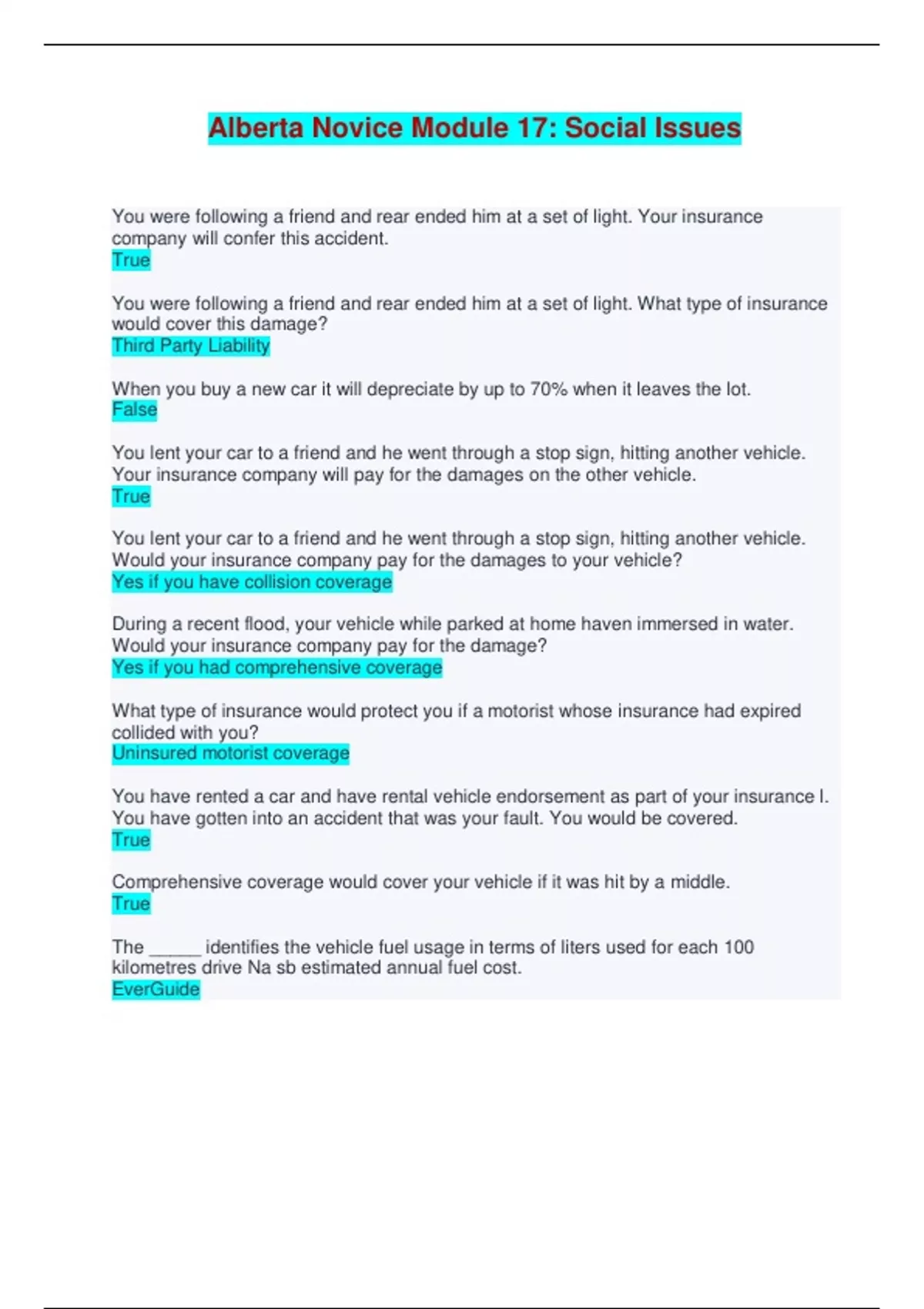 Alberta Novice Module 17: Social Issues - Q & A You were following a friend and rear ended him at a set of light. Your insurance company will confer this accident. True You were following a friend and rear ended him at a set of light. What type of insurance would cover this damage? Third Party Liability When you buy a new car it will depreciate by up to 70% when it leaves the lot. False