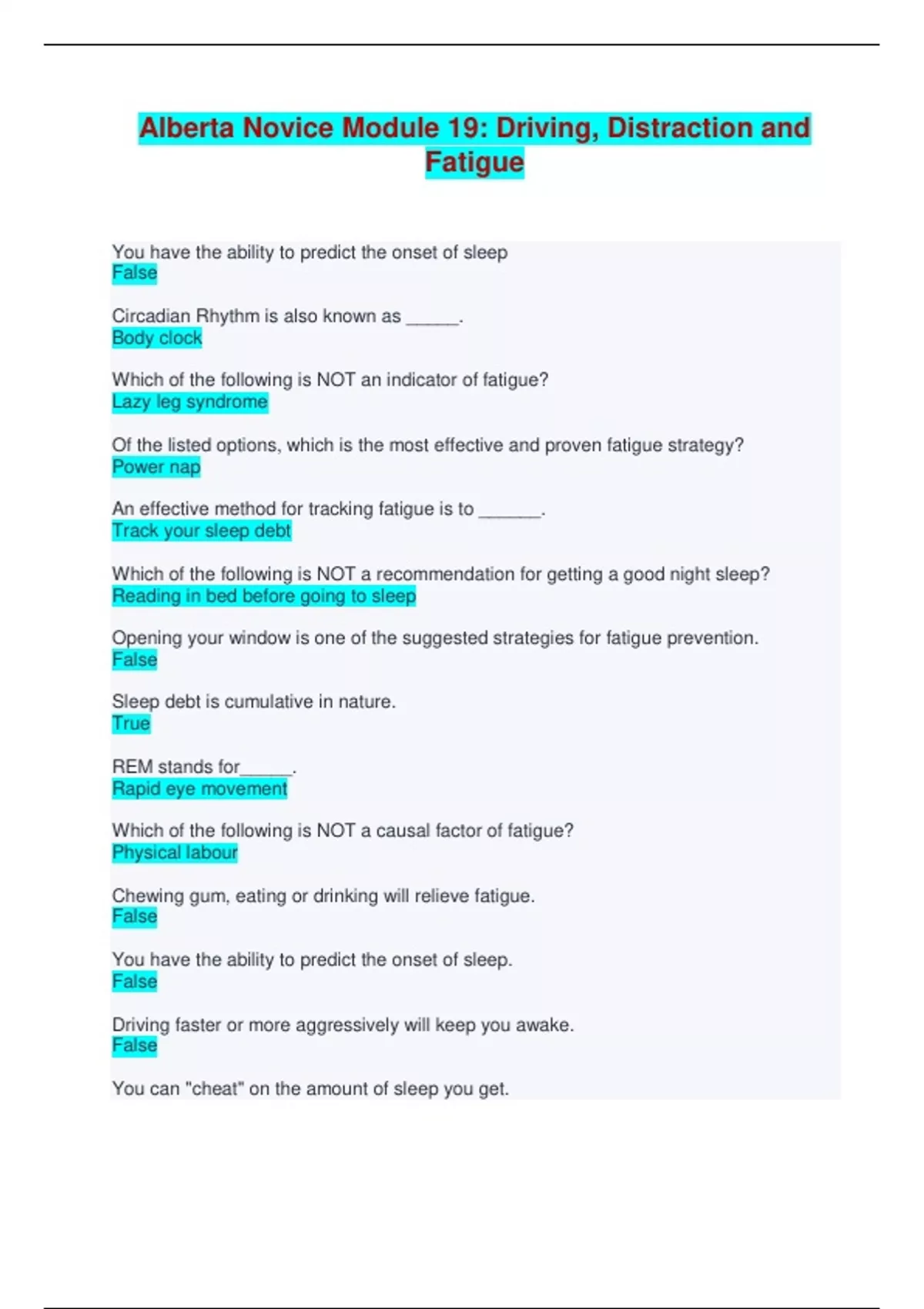 Alberta Novice Module 19: Driving, Distraction and Fatigue - Q & A You have the ability to predict the onset of sleep False Circadian Rhythm is also known as _____. Body clock Which of the following is NOT an indicator of fatigue? Lazy leg syndrome Of the listed options, which is the most effective and proven fatigue strategy? Power nap