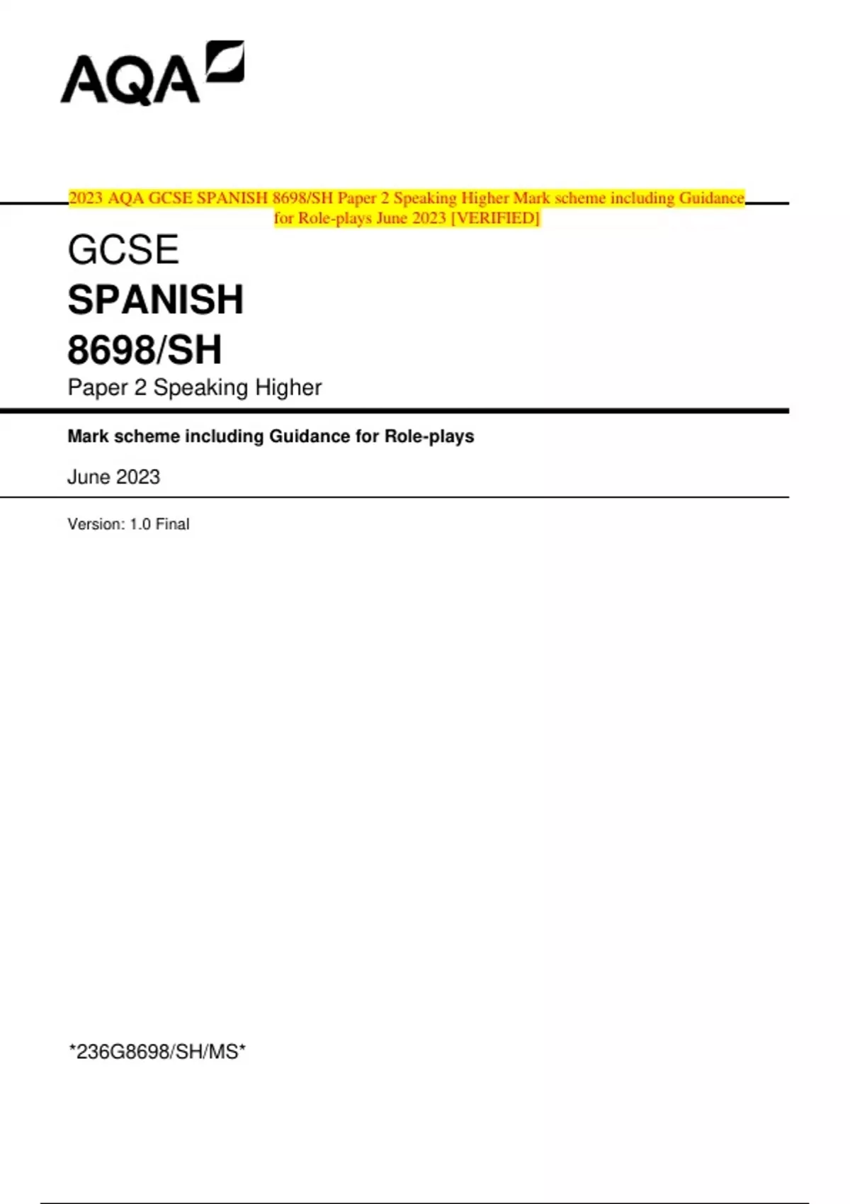 2023 AQA GCSE SPANISH 8698/SH Paper 2 Speaking Higher Mark scheme including Guidance for Role-plays June 2023 [VERIFIED]