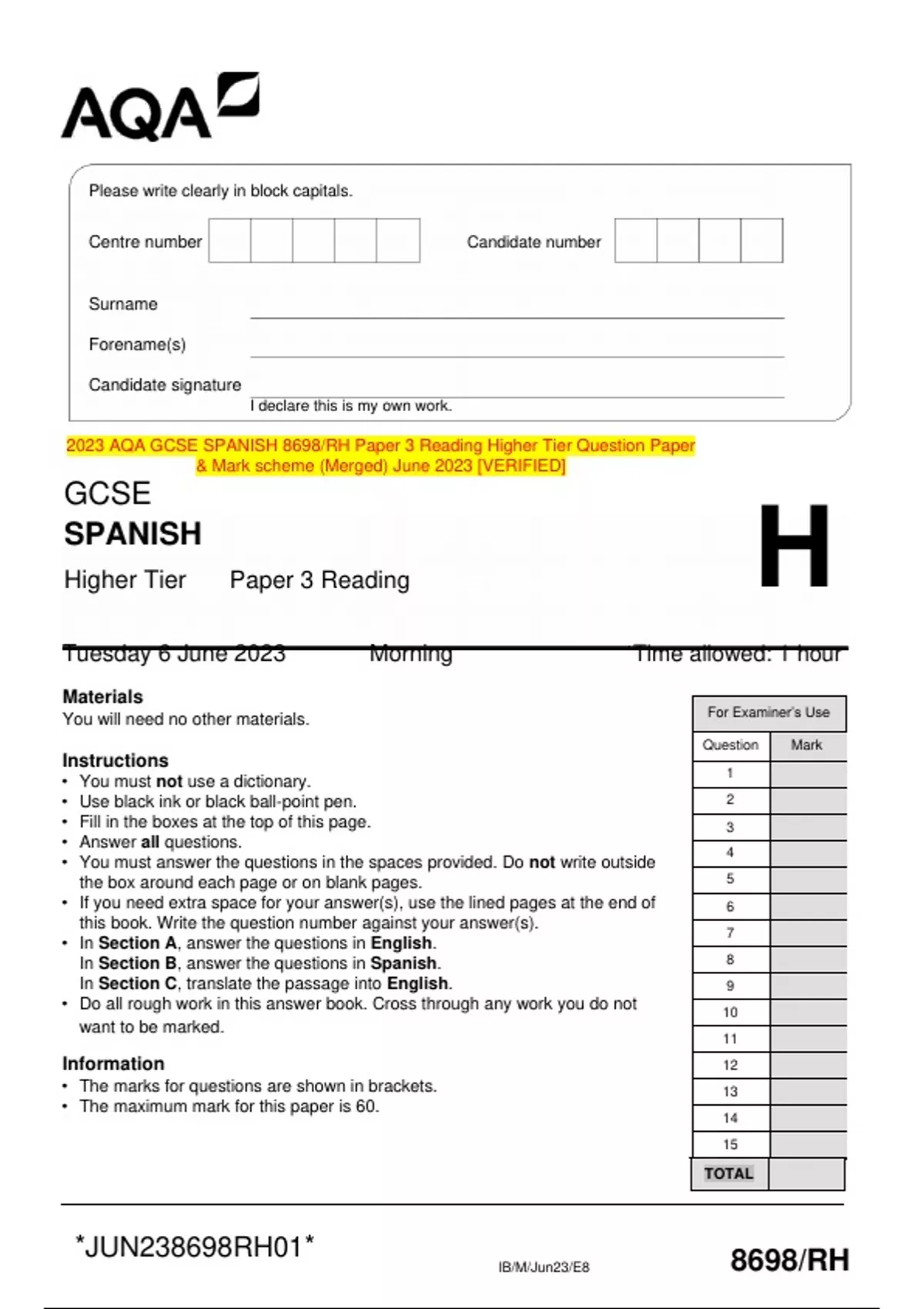 2023 AQA GCSE SPANISH 8698/RH Paper 3 Reading Higher Tier Question Paper & Mark scheme (Merged) June 2023 [VERIFIED]