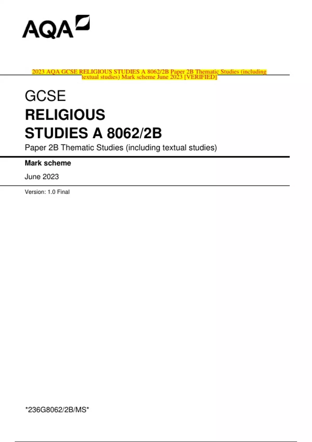 2023 AQA GCSE RELIGIOUS STUDIES A 8062/2B Paper 2B Thematic Studies (including textual studies) Mark scheme June 2023 [VERIFIED]