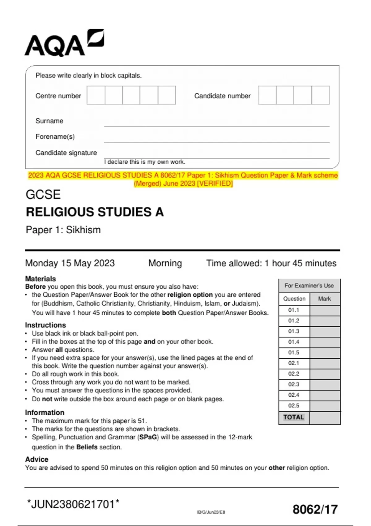 2023 AQA GCSE RELIGIOUS STUDIES A 8062/17 Paper 1: Sikhism Question Paper & Mark scheme (Merged) June 2023 [VERIFIED]