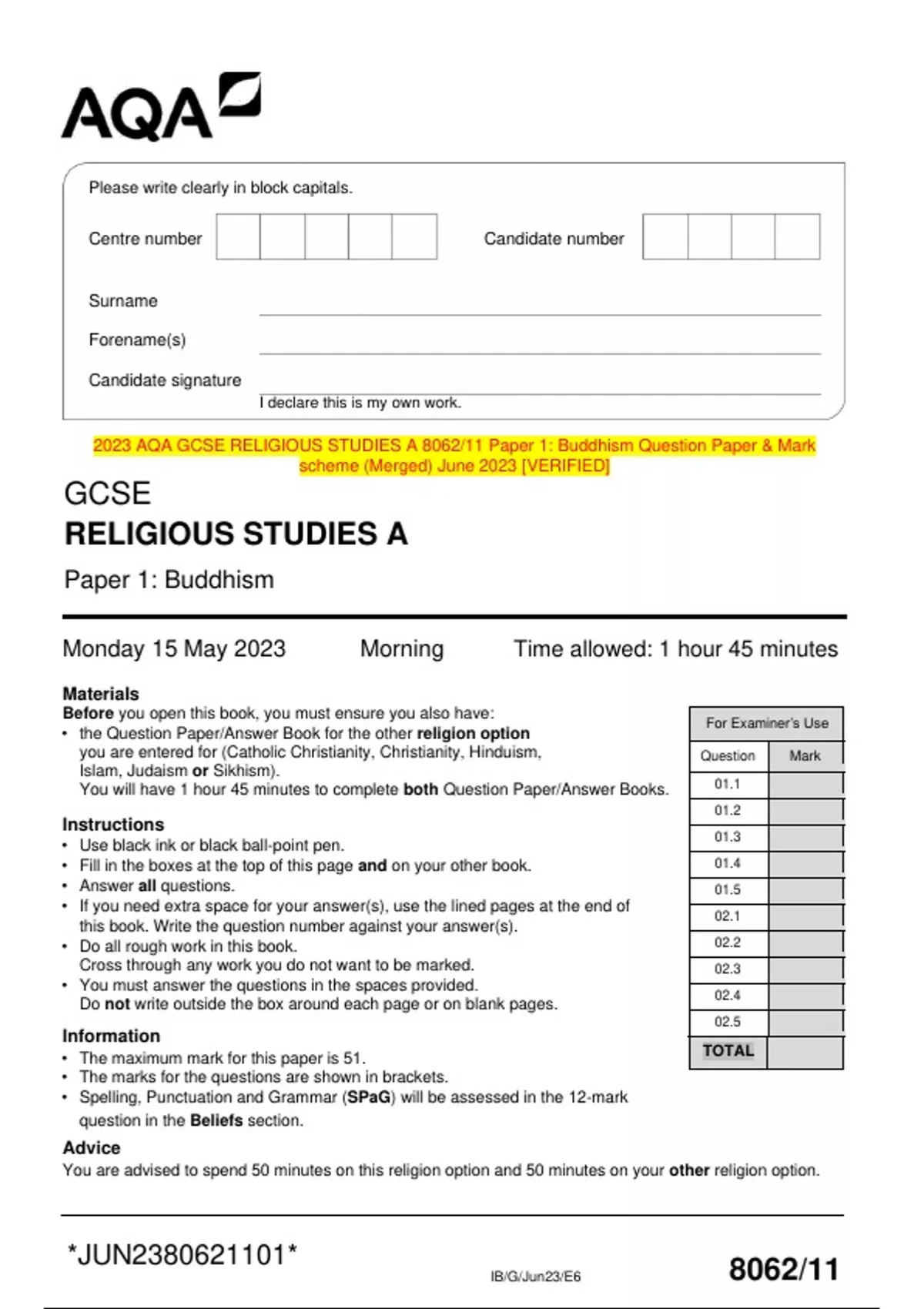 2023 AQA GCSE RELIGIOUS STUDIES A 8062/11 Paper 1: Buddhism Question Paper & Mark scheme (Merged) June 2023 [VERIFIED]