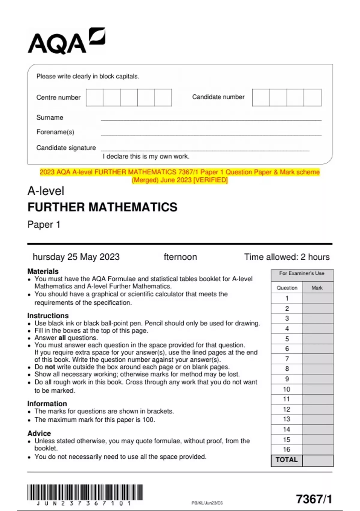 2023 AQA A-level FURTHER MATHEMATICS 7367/1 Paper 1 Question Paper & Mark scheme (Merged) June 2023 [VERIFIED]