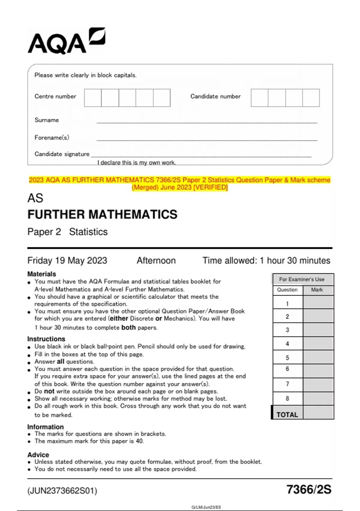2023 AQA AS FURTHER MATHEMATICS 7366/2S Paper 2 Statistics Question Paper & Mark scheme (Merged) June 2023 [VERIFIED]
