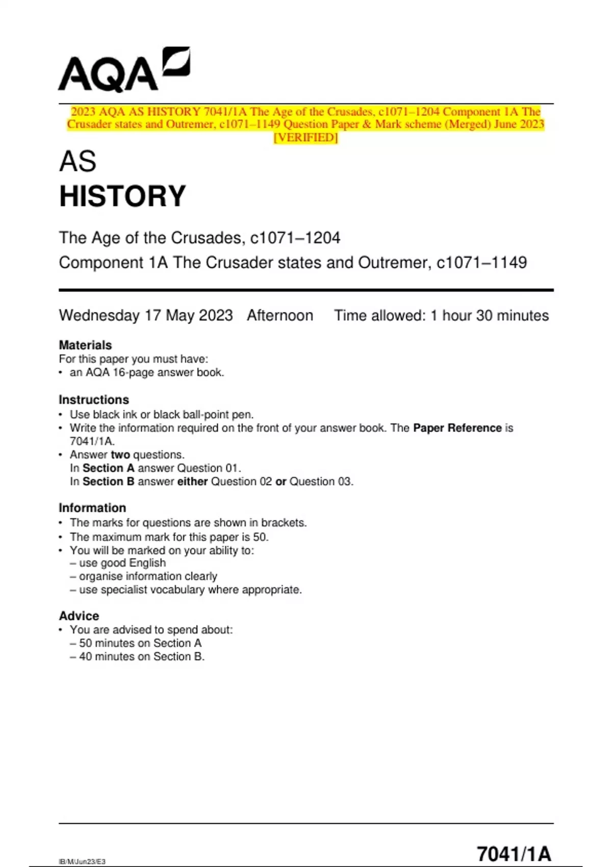 2023 AQA AS HISTORY 7041/1A The Age of the Crusades, c1071–1204 Component 1A The Crusader states and Outremer, c1071–1149 Question Paper & Mark scheme (Merged) June 2023 [VERIFIED]