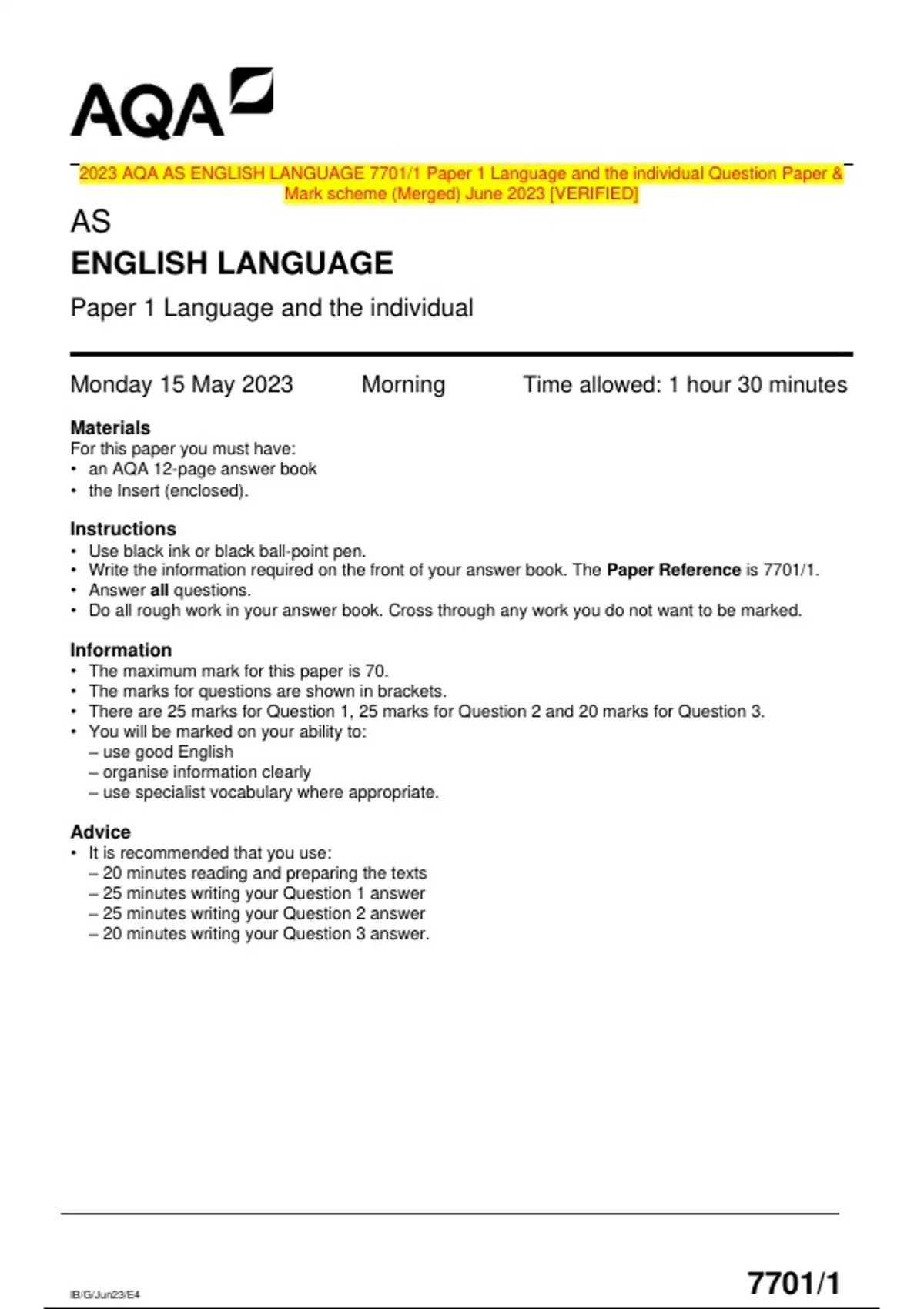 2023 AQA AS ENGLISH LANGUAGE 7701/1 Paper 1 Language and the individual Question Paper & Mark scheme (Merged) June 2023 [VERIFIED]
