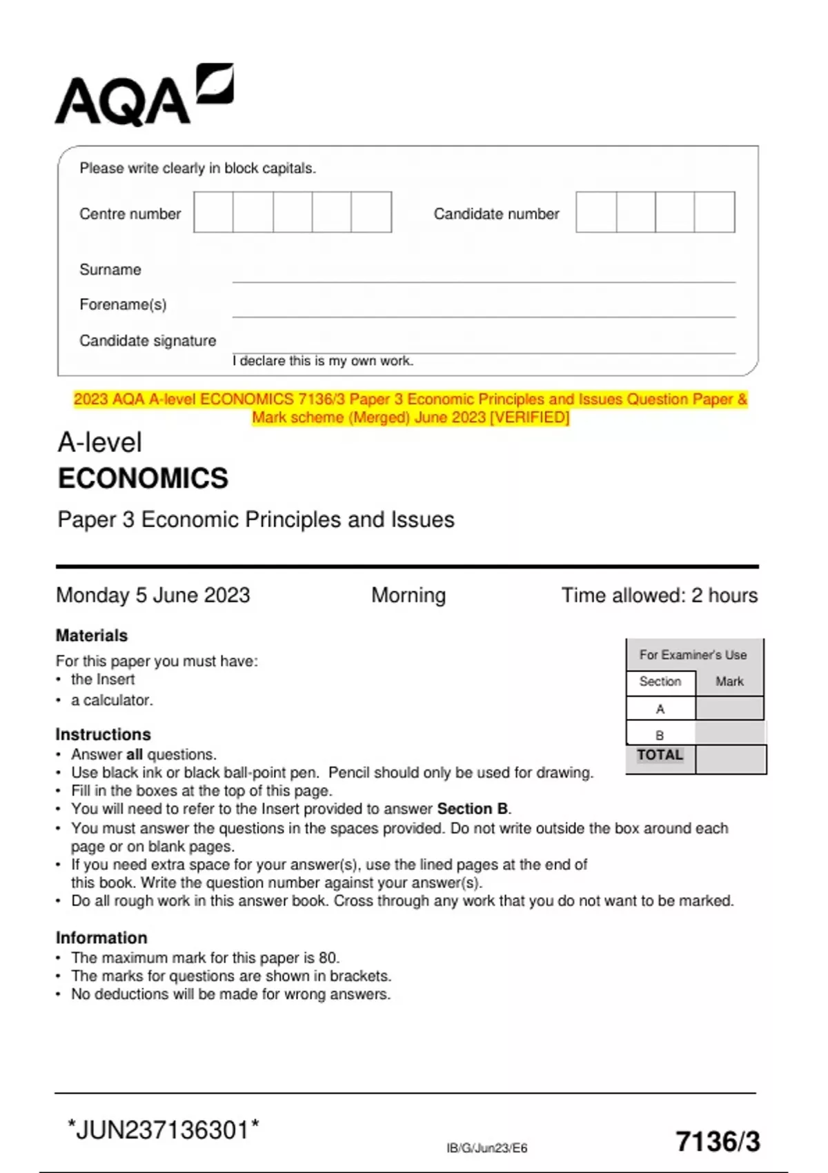 2023 AQA A-level ECONOMICS 7136/3 Paper 3 Economic Principles and Issues Question Paper & Mark scheme (Merged) June 2023 [VERIFIED]