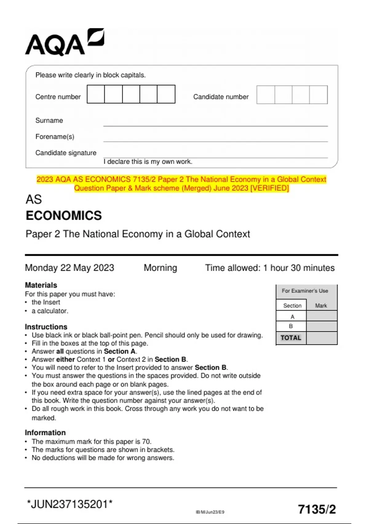 2023 AQA AS ECONOMICS 7135/2 Paper 2 The National Economy in a Global Context Question Paper & Mark scheme (Merged) June 2023 [VERIFIED]