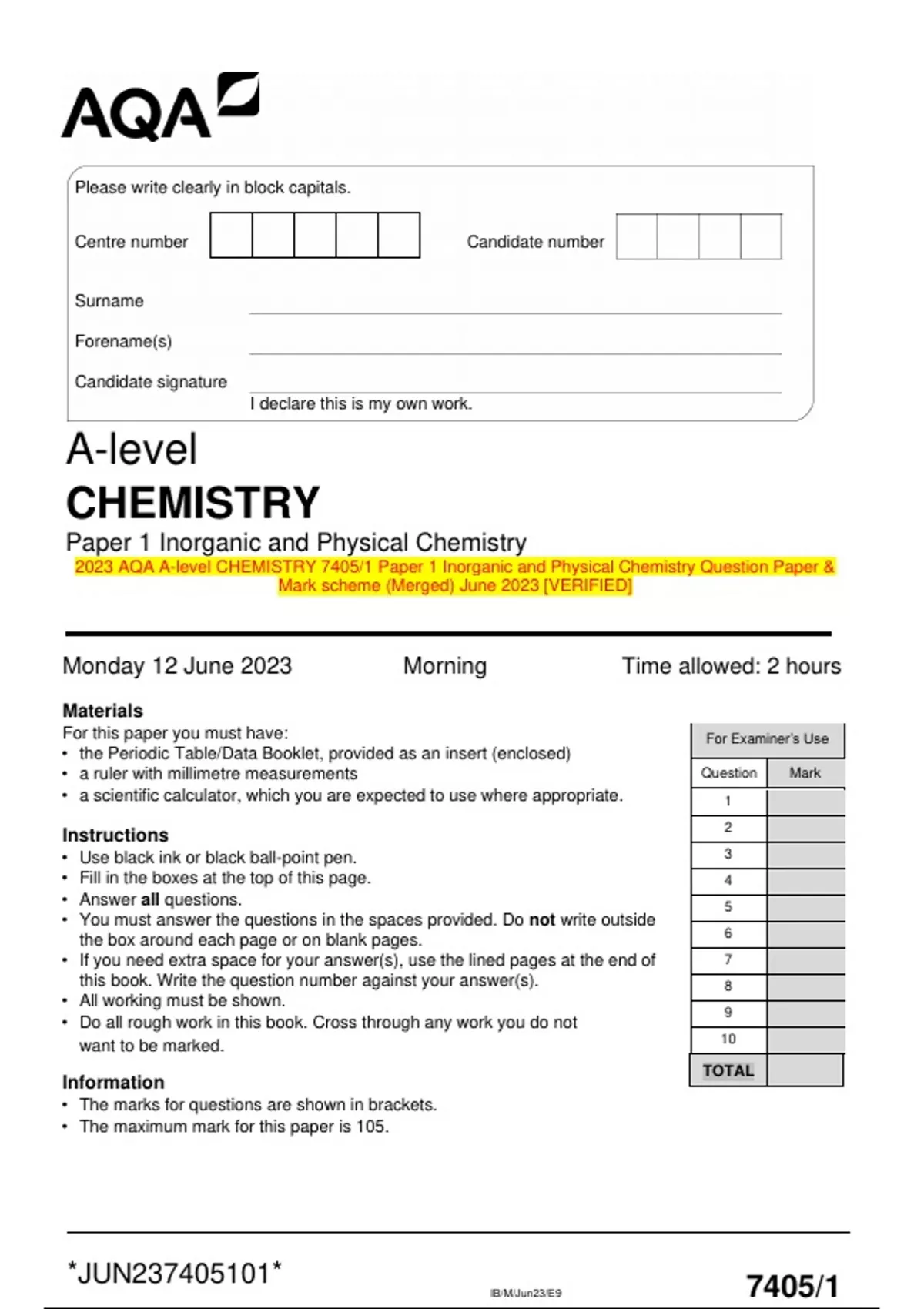 2023 AQA A-level CHEMISTRY 7405/1 Paper 1 Inorganic and Physical Chemistry Question Paper & Mark scheme (Merged) June 2023 [VERIFIED]