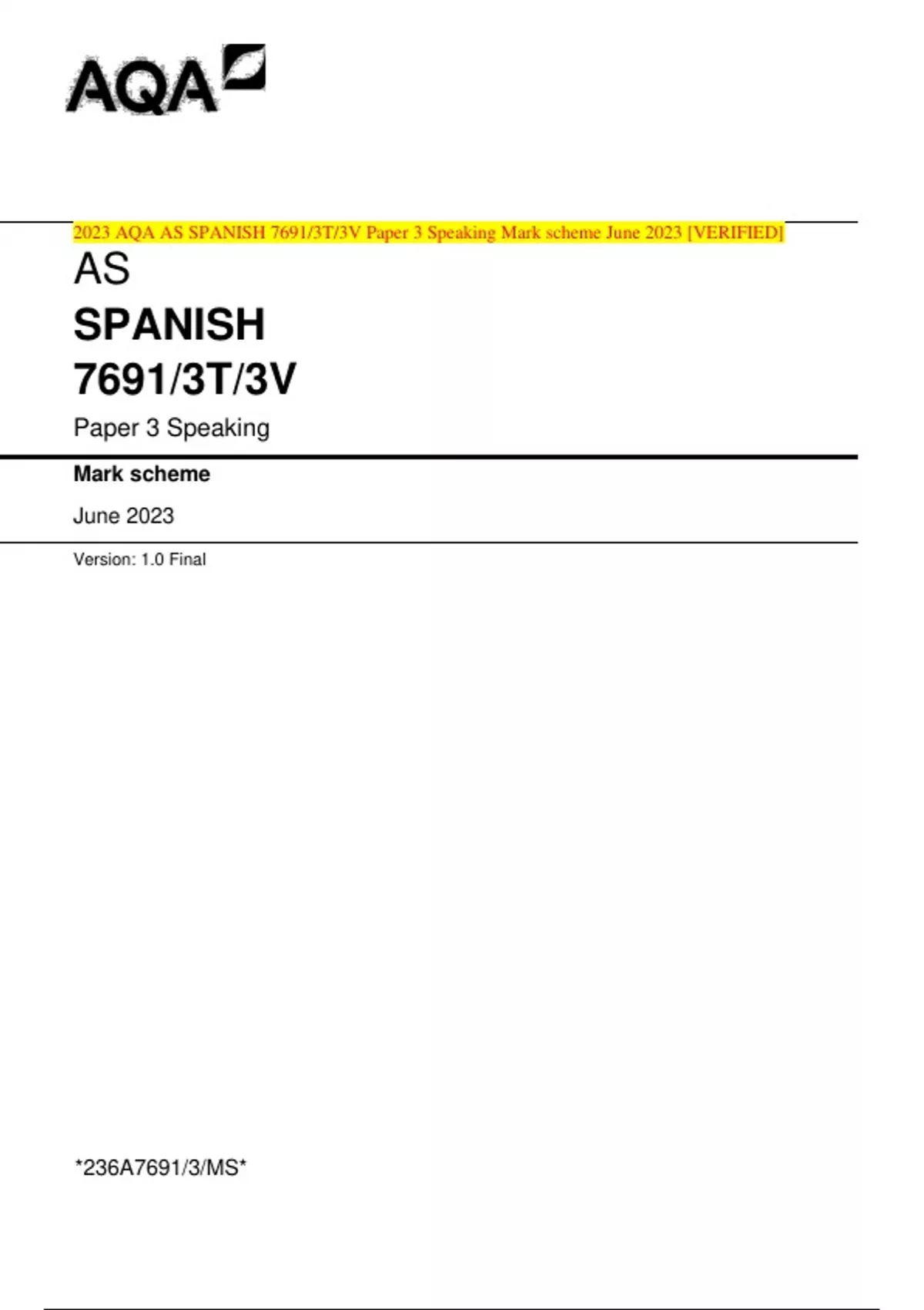2023 AQA AS SPANISH 7691/3T/3V Paper 3 Speaking Mark scheme June 2023 [VERIFIED]