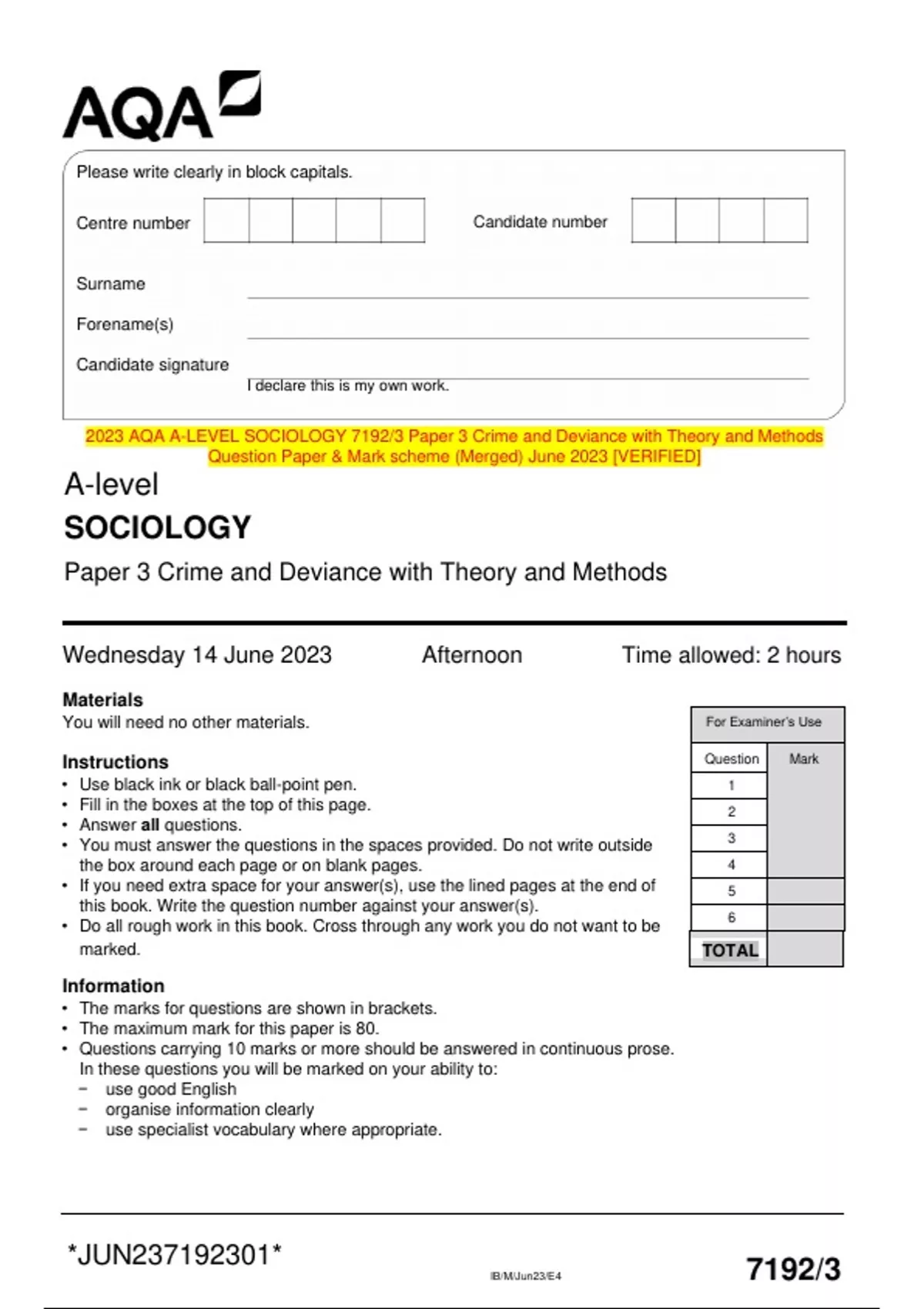 2023 AQA A-LEVEL SOCIOLOGY 7192/3 Paper 3 Crime and Deviance with Theory and Methods Question Paper & Mark scheme (Merged) June 2023 [VERIFIED]