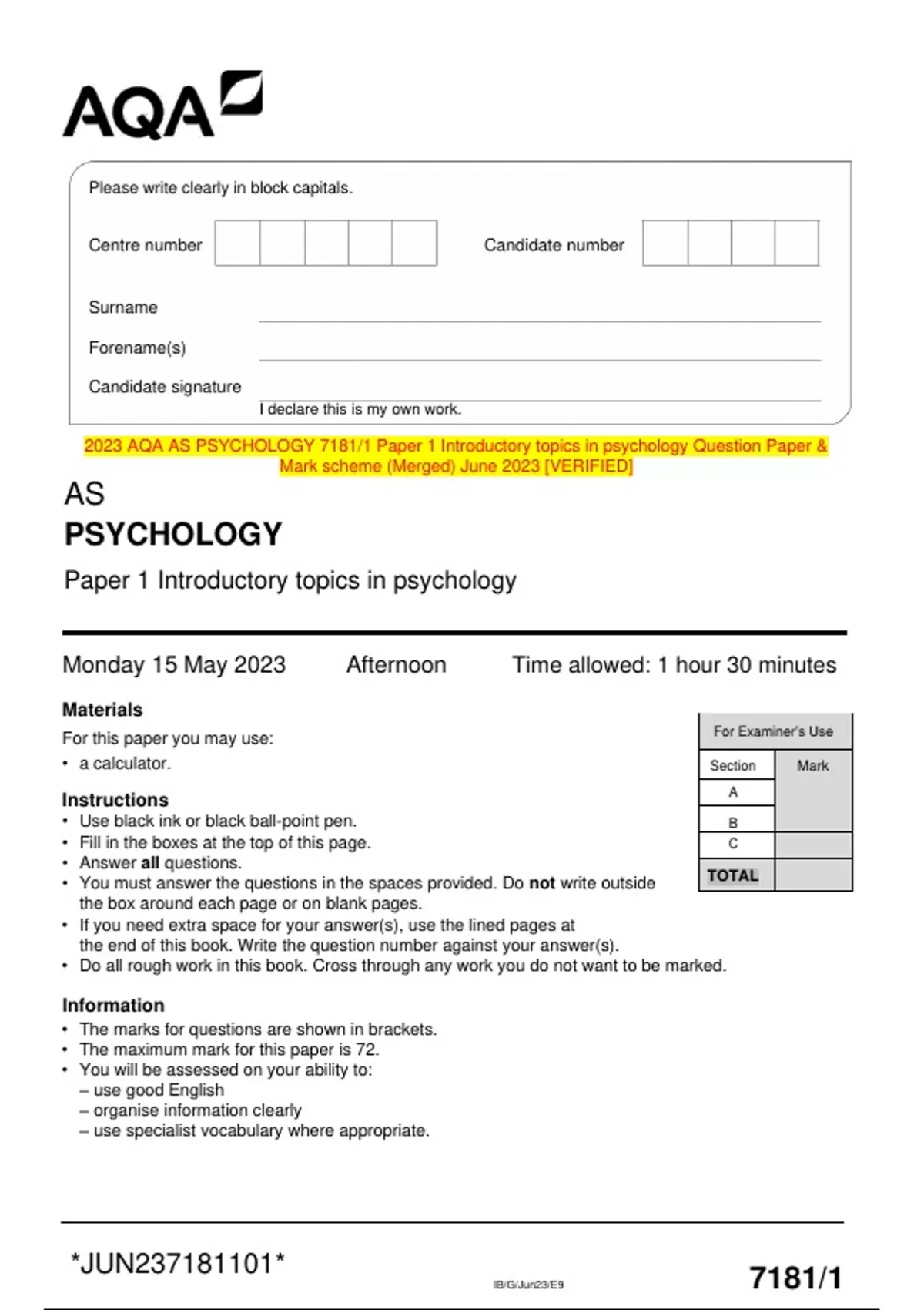 2023 AQA AS PSYCHOLOGY 7181/1 Paper 1 Introductory topics in psychology Question Paper & Mark scheme (Merged) June 2023 [VERIFIED]