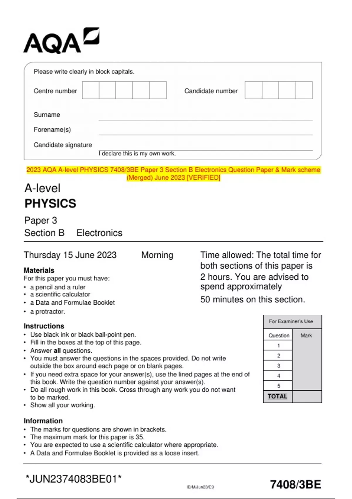 2023 AQA A-level PHYSICS 7408/3BE Paper 3 Section B Electronics Question Paper & Mark scheme (Merged) June 2023 [VERIFIED]