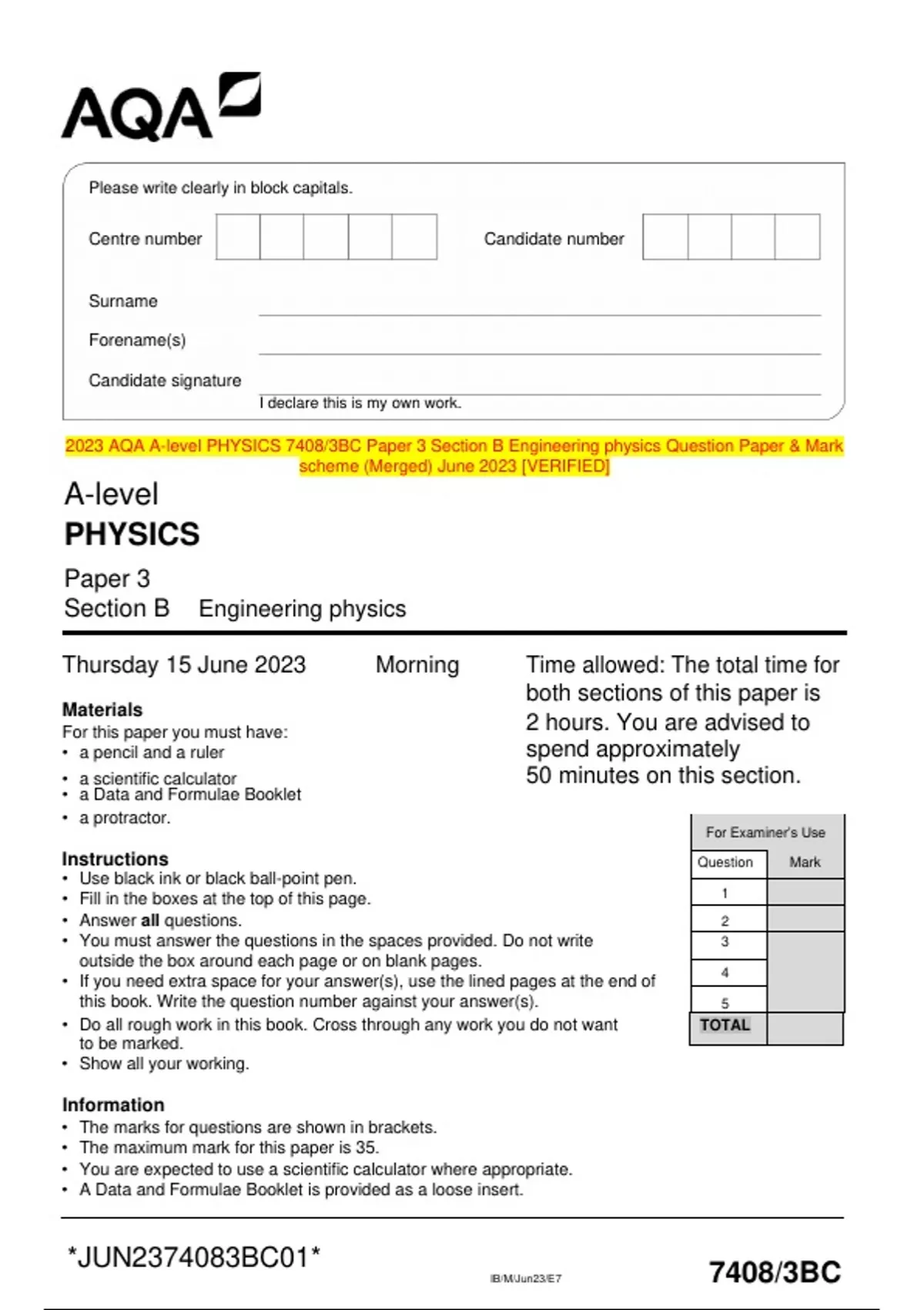 2023 AQA A-level PHYSICS 7408/3BC Paper 3 Section B Engineering physics Question Paper & Mark scheme (Merged) June 2023 [VERIFIED]