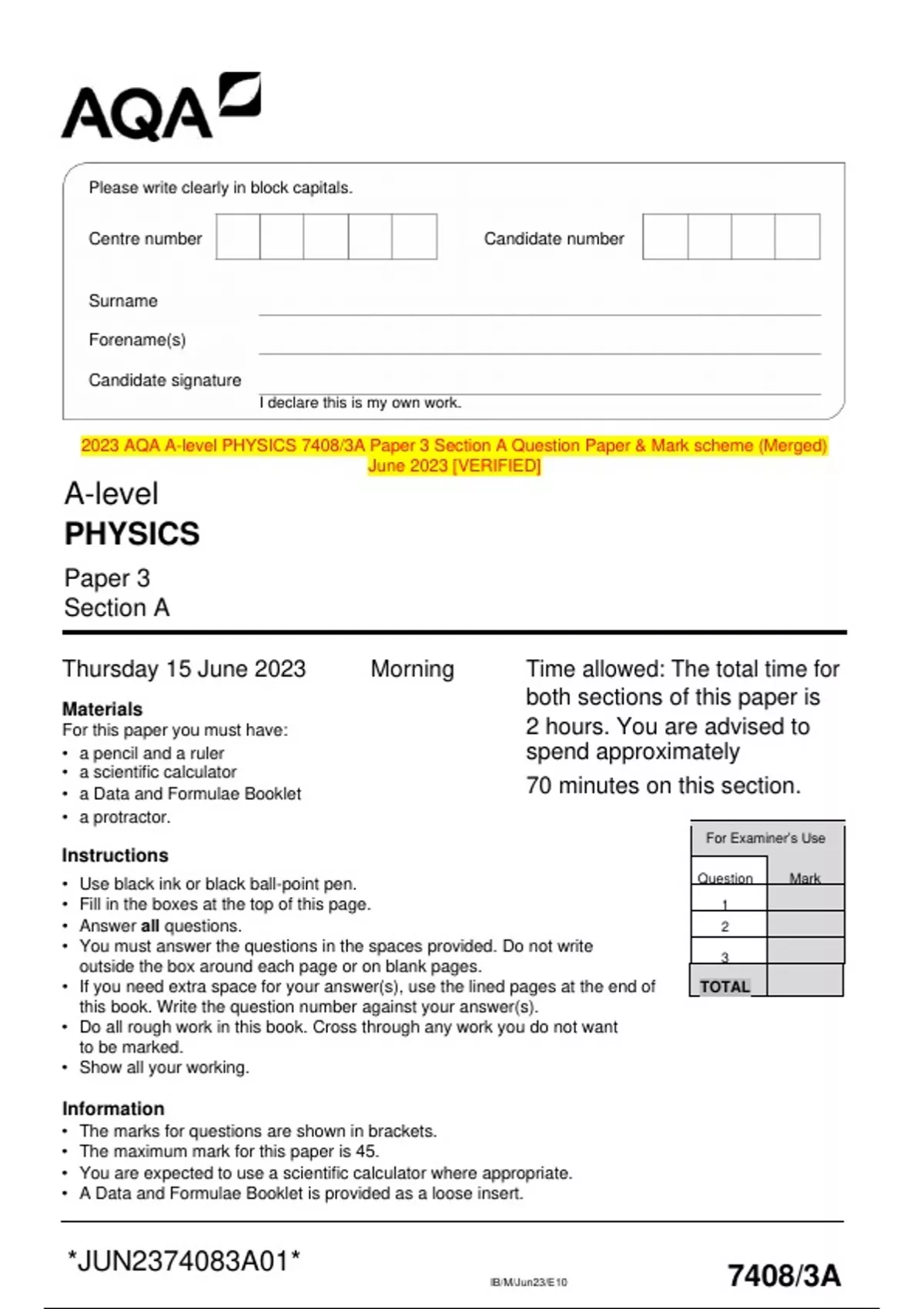 2023 AQA A-level PHYSICS 7408/3A Paper 3 Section A Question Paper & Mark scheme (Merged) June 2023 [VERIFIED]