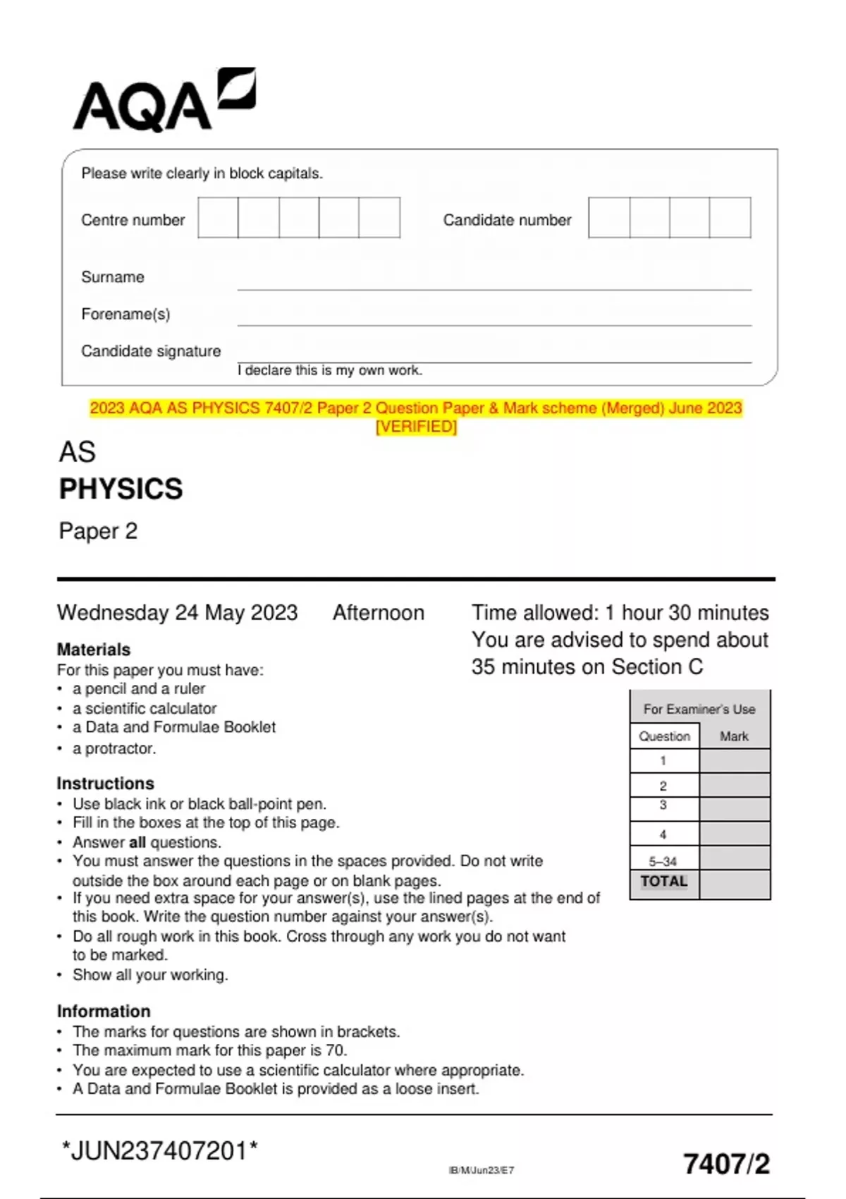 2023 AQA AS PHYSICS 7407/2 Paper 2 Question Paper & Mark scheme (Merged) June 2023 [VERIFIED]