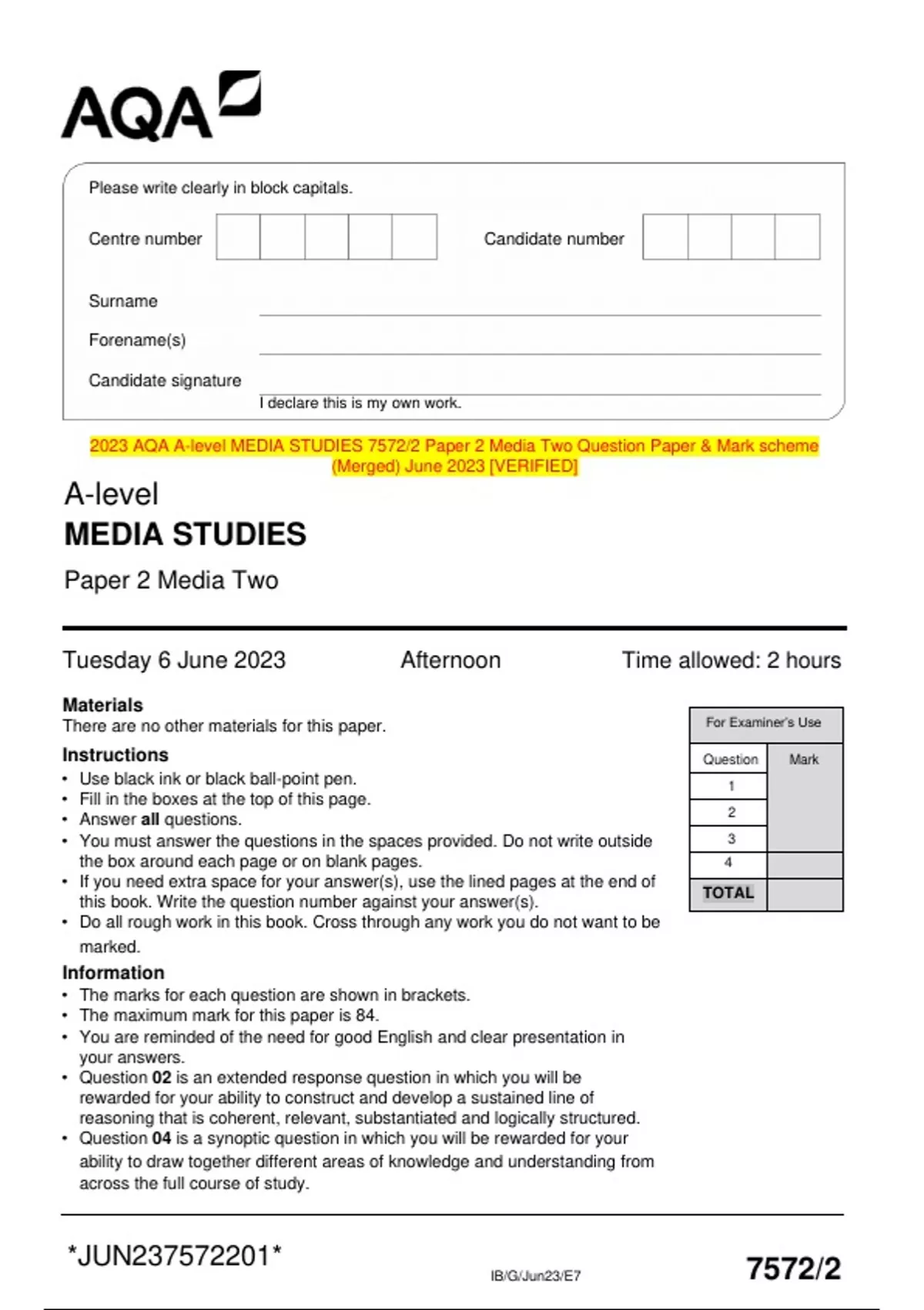 2023 AQA A-level MEDIA STUDIES 7572/2 Paper 2 Media Two Question Paper & Mark scheme (Merged) June 2023 [VERIFIED]