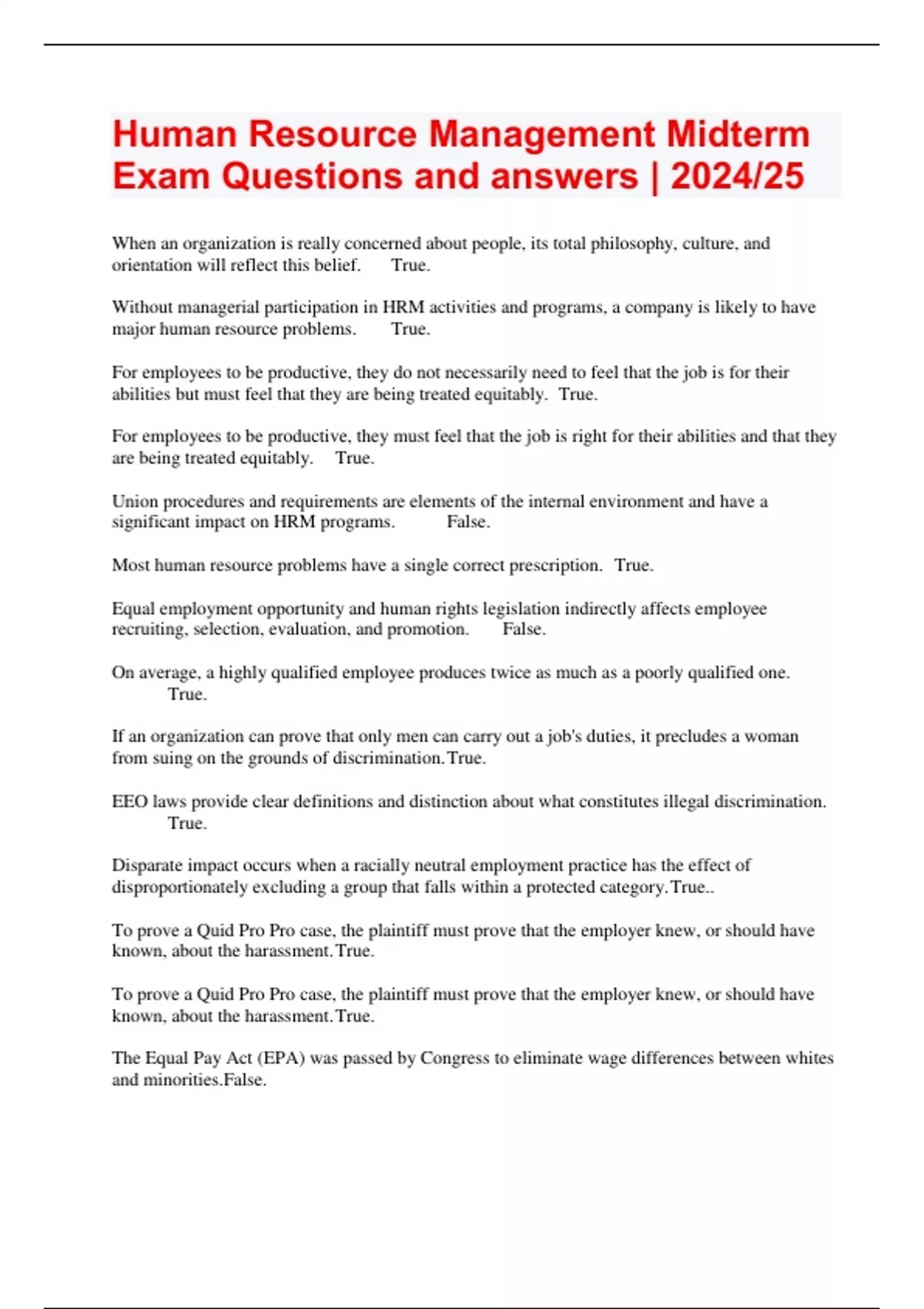 Human Resource Management Midterm Exam Questions and answers | 2024/25
