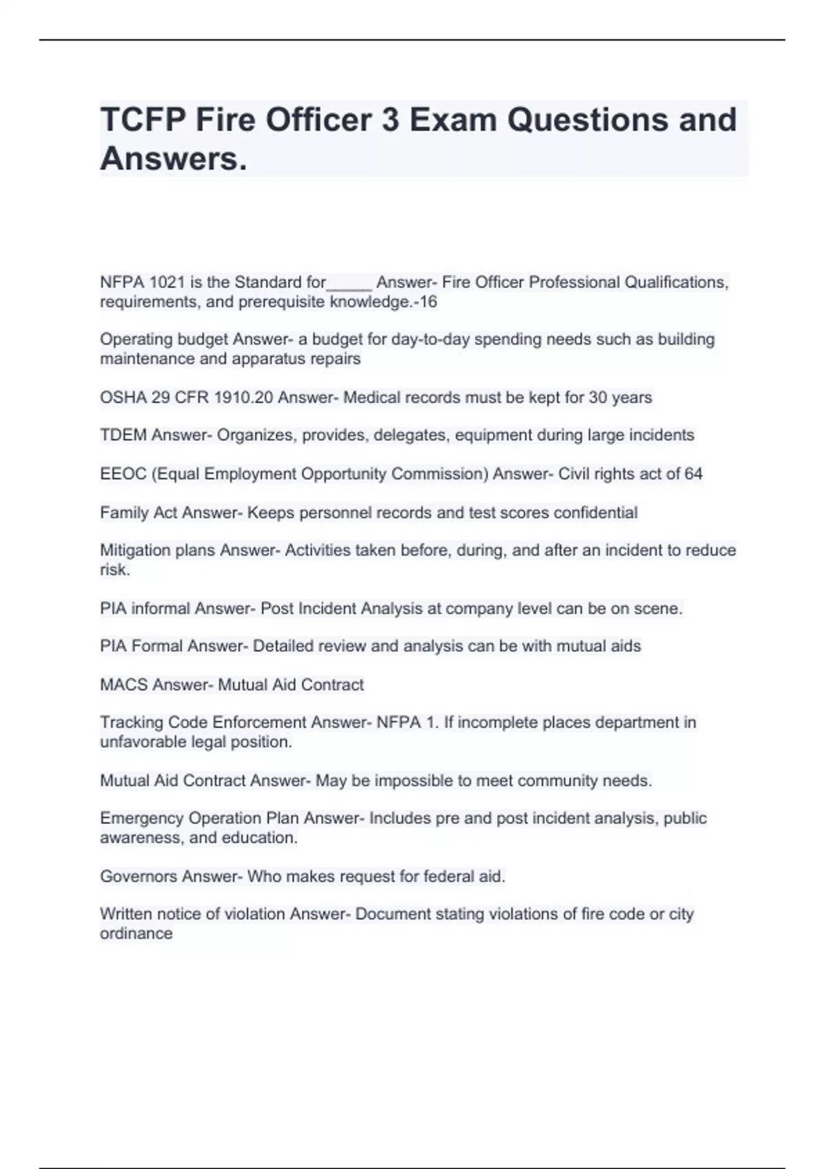 TCFP Fire Officer 3 Exam Questions and Answers-