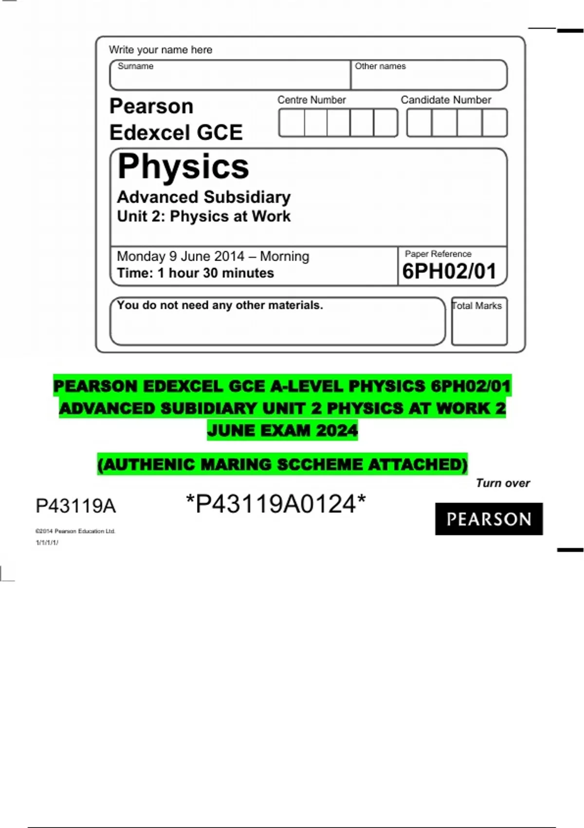 PEARSON EDEXCEL GCE A-LEVEL PHYSICS 6PH02/01 ADVANCED SUBIDIARY UNIT 2 PHYSICS AT WORK 2 JUNE EXAM 2024 (AUTHENIC MARING SCCHEME ATTACHED)
