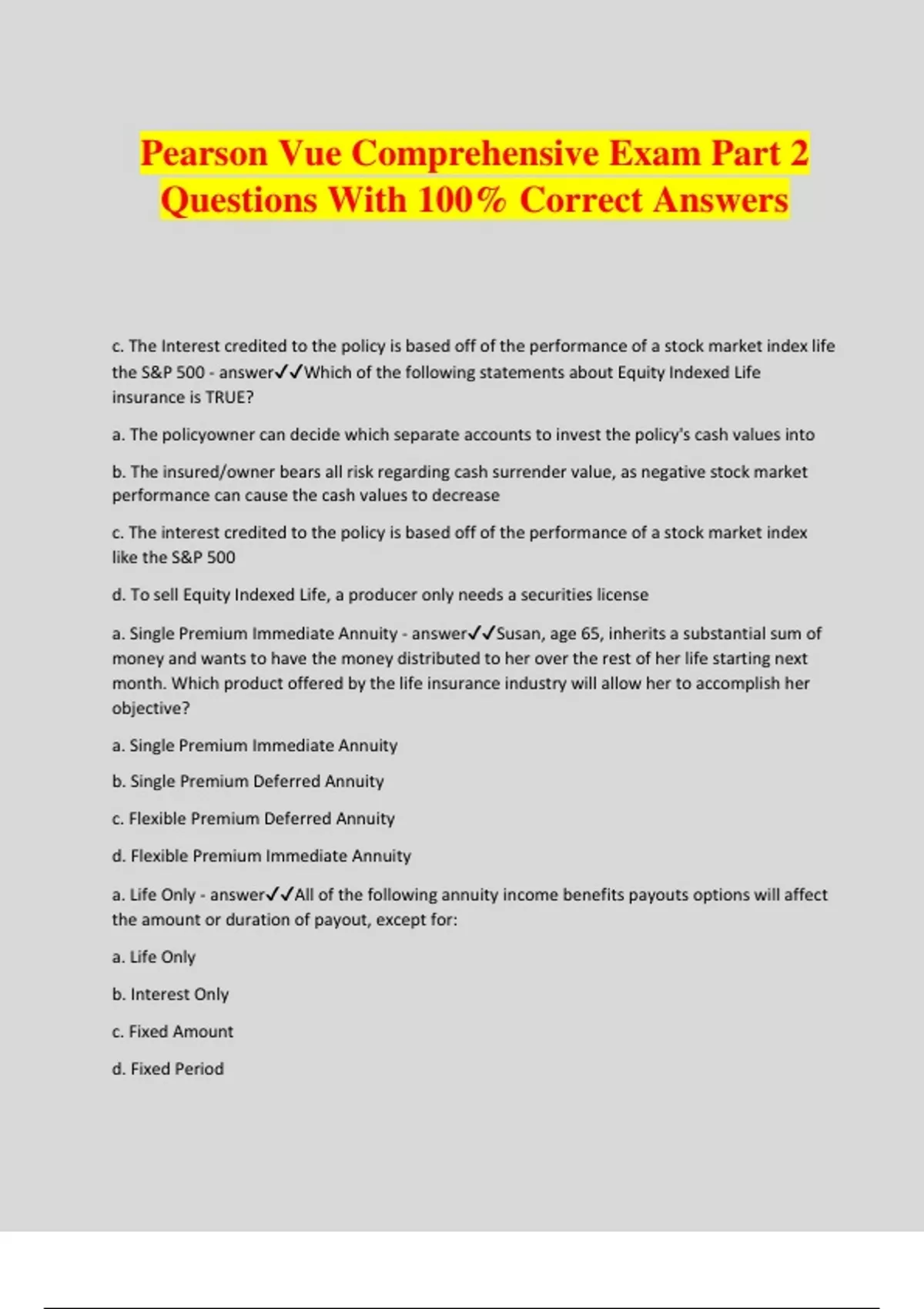 Pearson Vue Comprehensive Exam Part 2 Questions With 100% Correct Answers c. The Interest credited to the policy is based off of the performance of a stock market index life the S&P 500 - answerWhich of the following statements about Equity Indexed Life insurance is TRUE? a. The policyowner can decide which separate accounts to invest the policy's cash values into b. The insured/owner bears all risk regarding cash surrender value, as negative stock market performance can cause the cash values to decrease c. The interest credited to the policy is based off of the performance of a stock market index like the S&P 500 d. To sell Equity Indexed Life, a producer only needs a securities license a. Single Premium Immediate Annuity - answerSusan, age 65, inherits a substantial sum of money and wants to have the money distributed to her over the rest of her life starting next month. Which product offered by the life insurance industry will allow her to accomplish her objective? a. Single Premium Immediate Annuity b. Single Premium Deferred Annuity c. Flexible Premium Deferred Annuity d. Flexible Premium Immediate Annuity a. Life Only - answerAll of the following annuity income benefits payouts options will affect the amount or duration of payout, except for: a. Life Only b. Interest Only c. Fixed Amount d. Fixed Period d. Insurers - answer____________ manufacture and sell insurance coverage in the form of policies or contracts of insurance. a. Insureds b. Producers c. Agencies d. Insurers d. Life Income - answerJames is nearing retirement and has accumulated $175,000 in an annuity. He wants the largest possible monthly benefit for as long as he lives. Which option should he choose? a. Fixed Amount b. Life Income with Refund c. Joint Life d. Life Income a. Establishing new insurance laws - answerWhich of the following is not one of the Insurance Commissioner's duties? a. Establish new insurance law b. Conducting investigations c. Issuing Certificates of Authority d. Examining Insurers c. As long as there is sufficient cash value to cover policy expenses due, the insured is not required to pay the planned premium - answerWhich of the following is a true characteristic of a Variable Universal Life Policy. a. The insurer bears all risks in accumulating