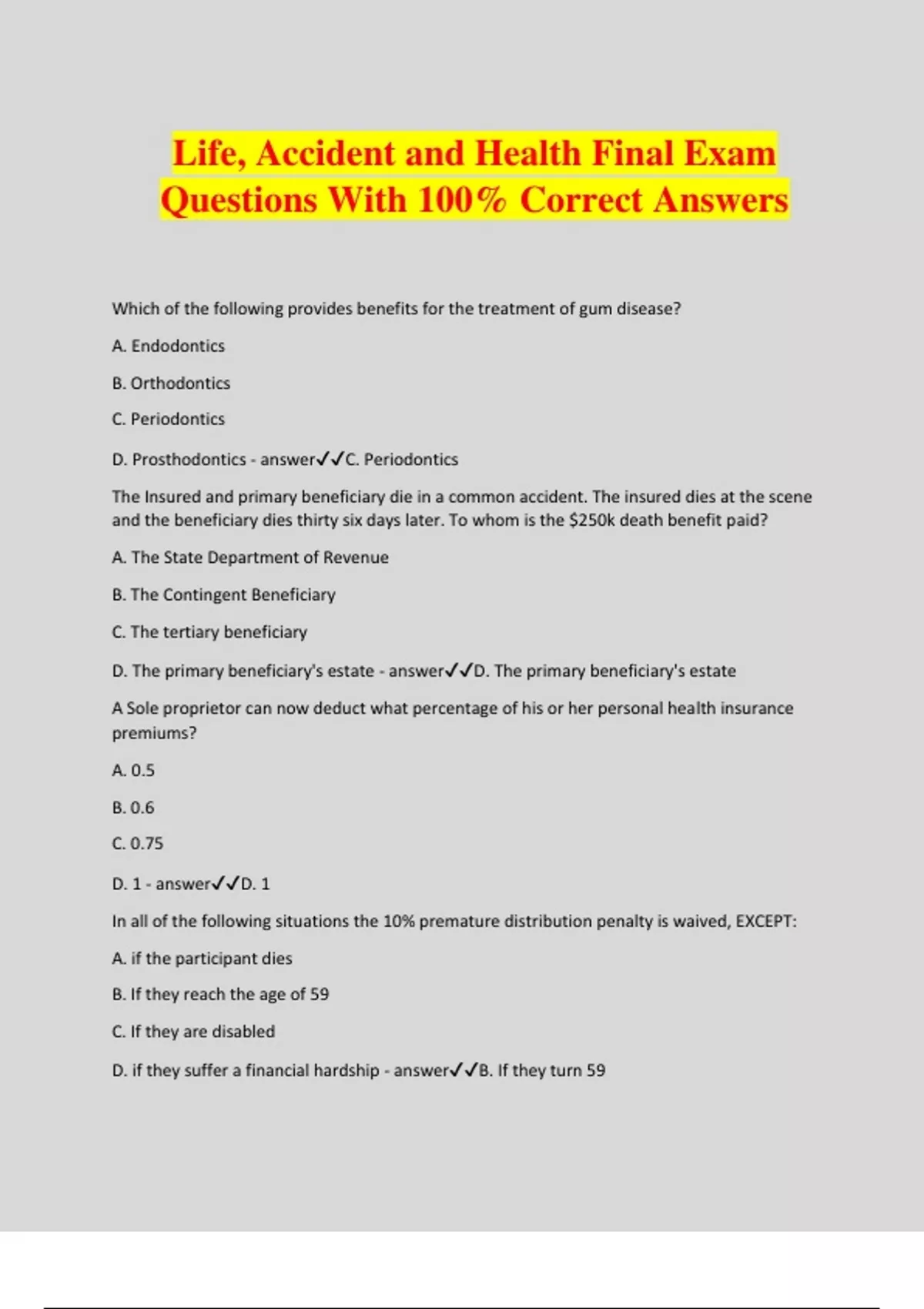 Life, Accident and Health Final Exam Questions With 100% Correct Answers Which of the following provides benefits for the treatment of gum disease? A. Endodontics B. Orthodontics C. Periodontics D. Prosthodontics - answerC. Periodontics The Insured and primary beneficiary die in a common accident. The insured dies at the scene and the beneficiary dies thirty six days later. To whom is the $250k death benefit paid? A. The State Department of Revenue B. The Contingent Beneficiary C. The tertiary beneficiary D. The primary beneficiary's estate - answerD. The primary beneficiary's estate A Sole proprietor can now deduct what percentage of his or her personal health insurance premiums? A. 0.5 B. 0.6 C. 0.75 D. 1 - answerD. 1 In all of the following situations the 10% premature distribution penalty is waived, EXCEPT: A. if the participant dies B. If they reach the age of 59 C. If they are disabled D. if they suffer a financial hardship - answerB. If they turn 59 When must a Buyer's Guide be provided to an insurance applicant? A.No later than time of policy delivery B. At time of application prior to premium collection C. At time of application just after premium collection D. Anytime after the home office underwriting begins - answerB. At time of application prior to premium collection Ted is only able to pay $25 per month for a life insurance policy. Which of the following policies would provide the greatest face amount of life insurance for this premium? A. Five year term life B. Ten Pay life C. An endowment D. Ordinary life - answerA. Five year term life Individual Disability income policies pay monthly benefits to an insured who is totally disabled. The benefits received by an insured are taxable if: A. The policyowner paid the premium B. The premium is payroll deducted C. The insured paid the premium D. The employer paid the premium - answerD. The employer paid the premium Many medical expense policies function on a reimbursement basis. All of the following are covered by a medical expense policy, EXCEPT: A. Routine Dental Treatment B. Diagnostic Testing Expenses C. Anesthesia Expenses D. X-Ray charges - answerA. Routine Dental treatment An accident and health policy is comprised of many provisions. The purpose of the coordination of benefits provision in group health insurance is to: A. Prevent profiting by owning an insurance policy B. Make the insured whole again following a loss C. Increase benefits for necessary surgery D. Reduce out-patient benefit payments - answerA. Prevent profiting by owning an insurance policy Jack owns a life insurance policy that requires that he pay premiums for a specified period only or until he dies, assuming this occurs prior to the end of the specified period. Which of the following types of policy does Jack possess? A. Limited Pay Life B. Variable life C. Straight Life D. Herbal Life - answerA. Limited Pay life The dismemberment benefit payable under an accidental death and dismemberment policy (AD&D) is known as the: Capital sum Principal sum Presumptive sum Municipal sum - answerCapital Sum Which of the following should a producer consider when replacing a health insurance policy? That there are no exclusions That the new cost is at least equal to or less That benefits are similar and no pre-existing coverage is lost That benefits are equivalent even if the cost of the new plan is a bit more expensive - answerThat benefits are similar and coverage for pre-existing conditions is not lost Permanent or continuous premium whole life insurance includes a policy loan provision. All of the following statements are true regarding this policy provision, EXCEPT: A policyowner need not pay off policy loans during the life of a contract A maximum fixed interest rate or variable rate on cash value borrowed is generally available If an unpaid loan exists when the insured dies, it will be subtracted from the face amount with the balance paid to the beneficiary A delay clause of twelve months is included in a policy loan provision - answerA delay clause of twelve months is included in a policy loan provision Whole life policies include several non-forfeiture values or options. What non-forfeiture option in this policy provides the greatest face amount of life insurance protection if selected? Surrender for cash Extended level term insurance Reduced paid-up insurance Fixed term option - answerExtended level term insurance Which of the following best describes an annuity payment option in which income is guaranteed in a specified amount of funds with the balance paid to a beneficiary if the annuitant dies? Cash refund annuity Fixed amount installment annuity Fixed period installment annuity Straight life annuity - answerFixed amount installment annuity Which of the following accurately describes an equity indexed annuity? It is a form of variable annuity It is a form of non-variable annuity It is a registered investment product It is a permanent insurance product - answerIt is a form on non-variable annuity The ABC Truck Company receives $187,000 from the key employee policy it purchased that covered one of their national sales managers. How will this benefit be looked upon from a taxation perspective? Taxable as ordinary income Not taxable as ordinary income The gains that exceed premiums pai