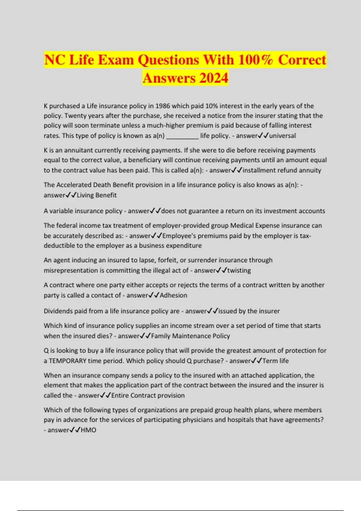 NC Life Exam Questions With 100% Correct Answers 2024 K purchased a Life insurance policy in 1986 which paid 10% interest in the early years of the policy. Twenty years after the purchase, she received a notice from the insurer stating that the policy will soon terminate unless a much-higher premium is paid because of falling interest rates. This type of policy is known as a(n) _________ life policy. - answeruniversal K is an annuitant currently receiving payments. If she were to die before receiving payments equal to the correct value, a beneficiary will continue receiving payments until an amount equal to the contract value has been paid. This is called a(n): - answerinstallment refund annuity The Accelerated Death Benefit provision in a life insurance policy is also knows as a(n): - answerLiving Benefit A variable insurance policy - answerdoes not guarantee a return on its investment accounts The federal income tax treatment of employer-provided group Medical Expense insurance can be accurately described as: - answerEmployee's premiums paid by the employer is tax- deductible to the employer as a business expenditure An agent inducing an insured to lapse, forfeit, or surrender insurance through misrepresentation is committing the illegal act of - answertwisting A contract where one party either accepts or rejects the terms of a contract written by another party is called a contact of - answerAdhesion Dividends paid from a life insurance policy are - answerissued by the insurer Which kind of insurance policy supplies an income stream over a set period of time that starts when the insured dies? - answerFamily Maintenance Policy Q is looking to buy a life insurance policy that will provide the greatest amount of protection for a TEMPORARY time period. Which policy should Q purchase? - answerTerm life When an insurance company sends a policy to the insured with an attached application, the element that makes the application part of the contract between the insured and the insurer is called the - answerEntire Contract provision Which of the following types of organizations are prepaid group health plans, where members pay in advance for the services of participating physicians and hospitals that have agreements? - answerHMO