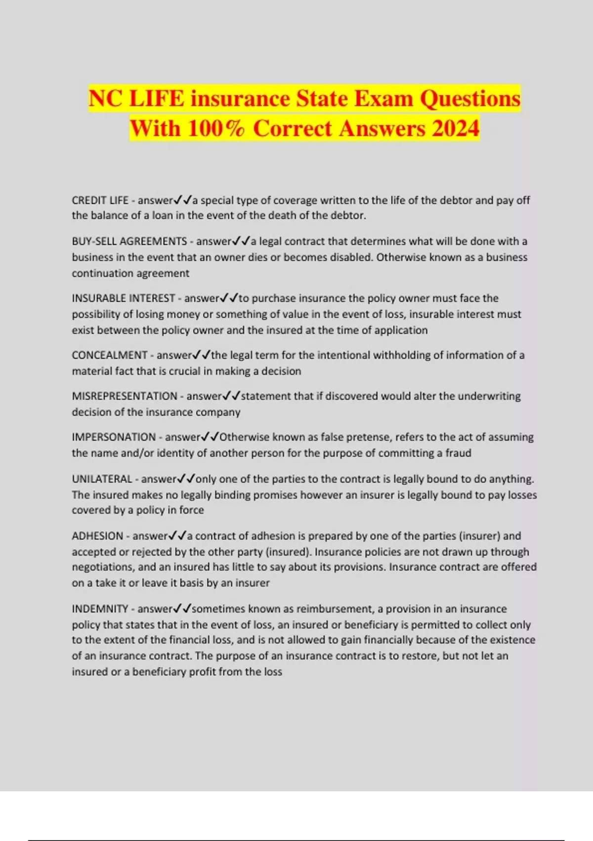 NC LIFE insurance State Exam Questions With 100% Correct Answers 2024 CREDIT LIFE - answera special type of coverage written to the life of the debtor and pay off the balance of a loan in the event of the death of the debtor. BUY-SELL AGREEMENTS - answera legal contract that determines what will be done with a business in the event that an owner dies or becomes disabled. Otherwise known as a business continuation agreement INSURABLE INTEREST - answerto purchase insurance the policy owner must face the possibility of losing money or something of value in the event of loss, insurable interest must exist between the policy owner and the insured at the time of application CONCEALMENT - answerthe legal term for the intentional withholding of information of a material fact that is crucial in making a decision MISREPRESENTATION - answerstatement that if discovered would alter the underwriting decision of the insurance company IMPERSONATION - answerOtherwise known as false pretense, refers to the act of assuming the name and/or identity of another person for the purpose of committing a fraud UNILATERAL - answeronly one of the parties to the contract is legally bound to do anything. The insured makes no legally binding promises however an insurer is legally bound to pay losses covered by a policy in force ADHESION - answera contract of adhesion is prepared by one of the parties (insurer) and accepted or rejected by the other party (insured). Insurance policies are not drawn up through negotiations, and an insured has little to say about its provisions. Insurance contract are offered on a take it or leave it basis by an insurer INDEMNITY - answersometimes known as reimbursement, a provision in an insurance policy that states that in the event of loss, an insured or beneficiary is permitted to collect only to the extent of the financial loss, and is not allowed to gain financially because of the existence of an insurance contract. The purpose of an insurance contract is to restore, but not let an insured or a beneficiary profit from the loss ALEATORY - answeran exchange of unequal amounts or values. The premium paid by the insured is small in relation to the amount that will be paid by the insurer in the event of a loss. CONDITIONAL - answerrequires that certain conditions must be met by the policy owner and the company in order for the contract to be executed and before each party fulfills its obligations. ELEMENTS OF A VALID CONTRACT - answerAgreement - Offer and Acceptance, Consideration, Competent Parties, Legal Purpose TERM LIFE INSURANCE - answertemporary protection because it only provides coverage for a specific period of time; pure death protection; if the insured dies during this term, the policy pays the death benefits to the beneficiary; if the policy is canceled or expires prior to the insured's death, nothing is payable at the end of the term; there is no cash value or other living benefits RENEWABILITY - answerallows the policy owner the right to renew the coverage at the expiration date without evidence of insurability. The premium will be based on the insured age at the time of renewing CONVERTIBILITY - answerprovision that provides the policy owner with the right to convert the policy to a permanent insurance policy without the evidence of insurability. Premium will be based on the insured's attaine