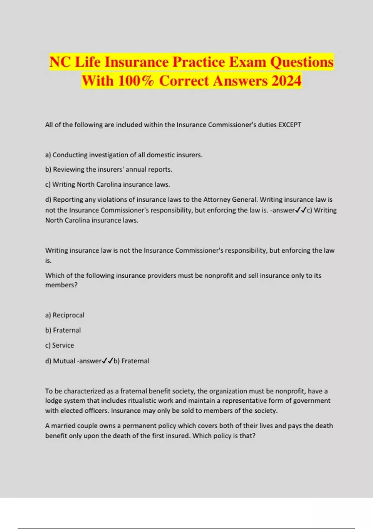 NC Life Insurance Practice Exam Questions With 100% Correct Answers 2024